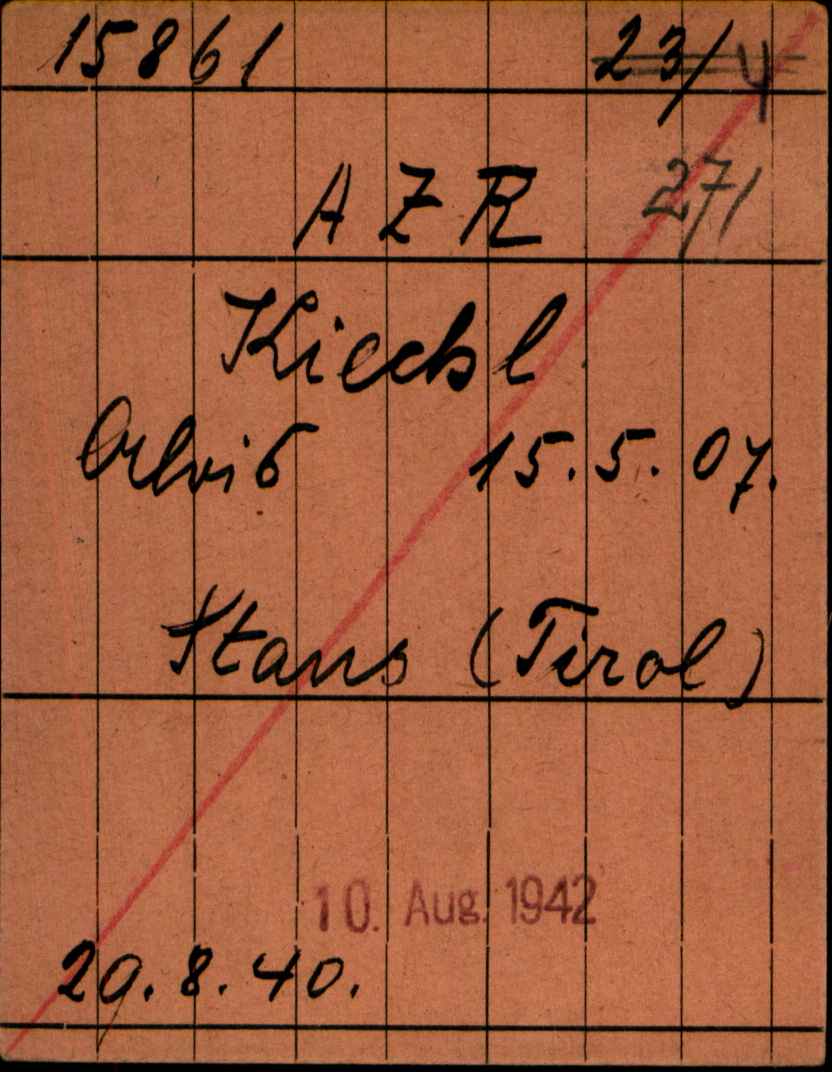 Alois Kiechl wird am 29. August 1940 ins KZ Dachau überstellt und erhält dort die Häftlingsnummer 15.861. Er gilt als asozial und wird nun unter der Kategorie AZR (Arbeitszwang Reich) geführt.