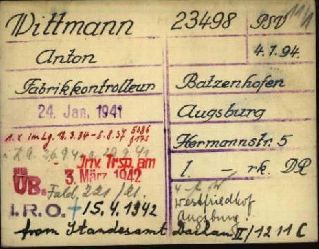 Annähernd 12.000 Menschen werden auf diese Weise auf Schloss Hartheim ermordet, davon viele aus Augsburg.20 Den Angehörigen von Anton Wittmann wird vorgegaukelt, Anton sei im KZ Dachau am 16. April 1942 verstorben. Auch das Todesdatum wird gefälscht, um wegen der Massentötung von Häftlingen kein Aufsehen zu erregen.21 Das Standesamt Dachau beurkundet als Sterbeursache: „Versagen von Herz und Kreislauf bei Lungenentzündung.“ Der Mutter wird mitgeteilt, dass die Leiche in Dachau feuerbestattet worden sei.22 , wovon keine Rede sein kann.