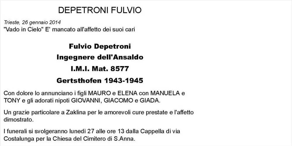 Fulvio Depetroni ist am 26. Januar 2014 in Triest verstorben.