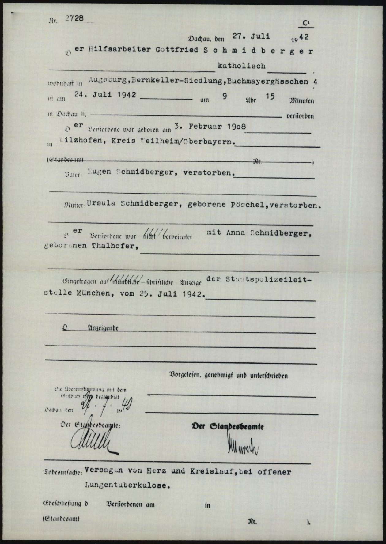 Am 28. Mai 1942 gelangt Gottfried Schmidberger mit der zweiten Welle der sogenannten Invalidentransporte nach Hartheim, wo er noch am gleichen Tag ermordet wird32 . Seine Todesurkunde gibt als Todesursache „Versagen von Herz und Kreislauf, bei offener Lungentuberkulose“ an. Todeszeitpunkt sei der 24. Juli 1942 in Dachau gewesen.