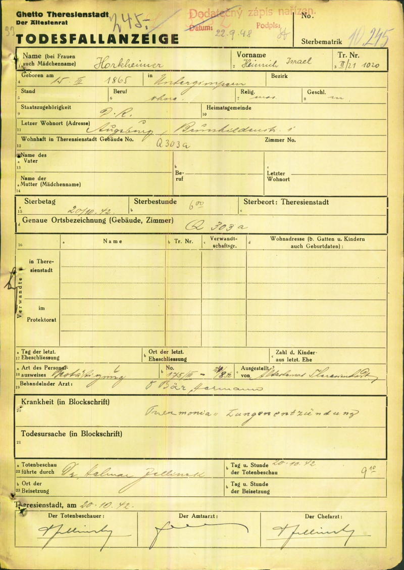 Danach wurde er ins Ghetto Theresienstadt deportiert, wo er am 20. Oktober 1942 aufgrund einer Pneumonie verstarb. vgl. Institut Terezinske iniciativy, 2016, HORKHEIMER HEINRICH: DEATH CERTIFICATE, GHETTO TEREZIN, 08.11.2021. https://www.holocaust.cz/en/database-of-digitised-documents/document/87021- horkheimer-heinrich-death-certificate-ghetto-terezin/.