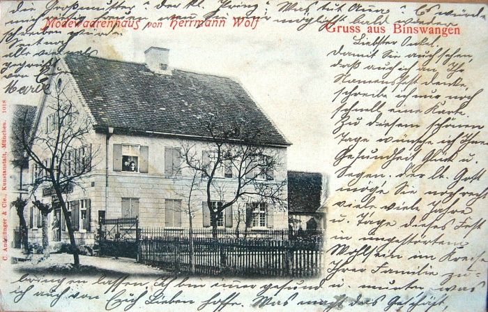 Als bayerischer Staatsbürger diente Hermann Wolf vor seiner Heirat von 1892 bis 1894 in der Bayerischen Armee, er war Teil des 3. Infanterieregiments der 8. Kompanie.8 In Krumbach heiratete er am 22. Mai 1899 die jüdische Krumbacherin Sabine Höchstädter, geboren am 17. Februar 1877.9 Nach ihrer Heirat wohnte das Ehepaar zunächst in Binswangen, wo die Tochter Cläry10 am 26.08.1901 und der Sohn Bernhard am 19.07.1903 geboren wurden.11