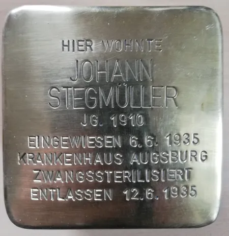 Seit seinem 6. Lebensjahr wird Johann von epileptischen Anfällen geplagt. Das Gesundheitsamt Augsburg hat zwar eine Karteikarte zu Johann Stegmüller angelegt, allerdings sind keine Aktenvorgänge überliefert. Die Epilepsie von Johann wird folglich erst während der Zeit des Nationalsozialismus 1934 aktenkundig.16
