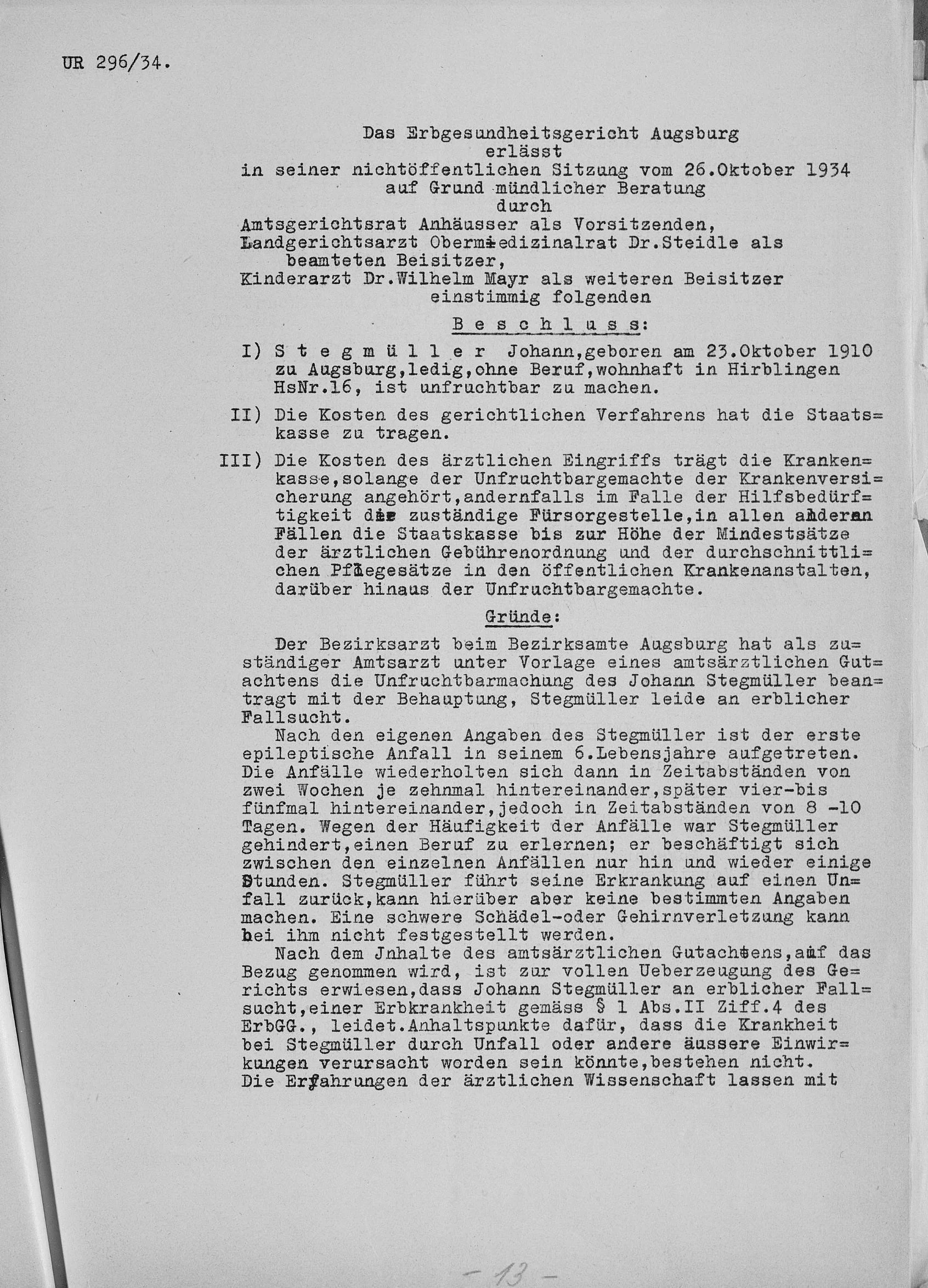 Unter Berufung auf Art. 1 Abs. 2 Ziffer 4 des Erbgesundheitsgesetzes kommt das Erbgesundheitsgericht Augsburg unter Vorsitz von Amtsgerichtsrat Anhäußer, assistiert von Landgerichtsarzt Obermedizinalrat Dr. Steidle und dem Kinderarzt Dr. Wilhelm Mayr, am 26. Oktober 1934 zum einstimmigen Beschluss, Johann Stegmüller unfruchtbar zu machen. Es sei mit „großer Wahrscheinlichkeit zu erwarten, dass etwaige Nachkommen des Stegmüller an schweren körperlichen oder geistigen Erbschäden leiden werden.“ Die Krankheit sei „durch einen für das Deutsche Reich approbierten Arzt einwandfrei festgestellt“20 .