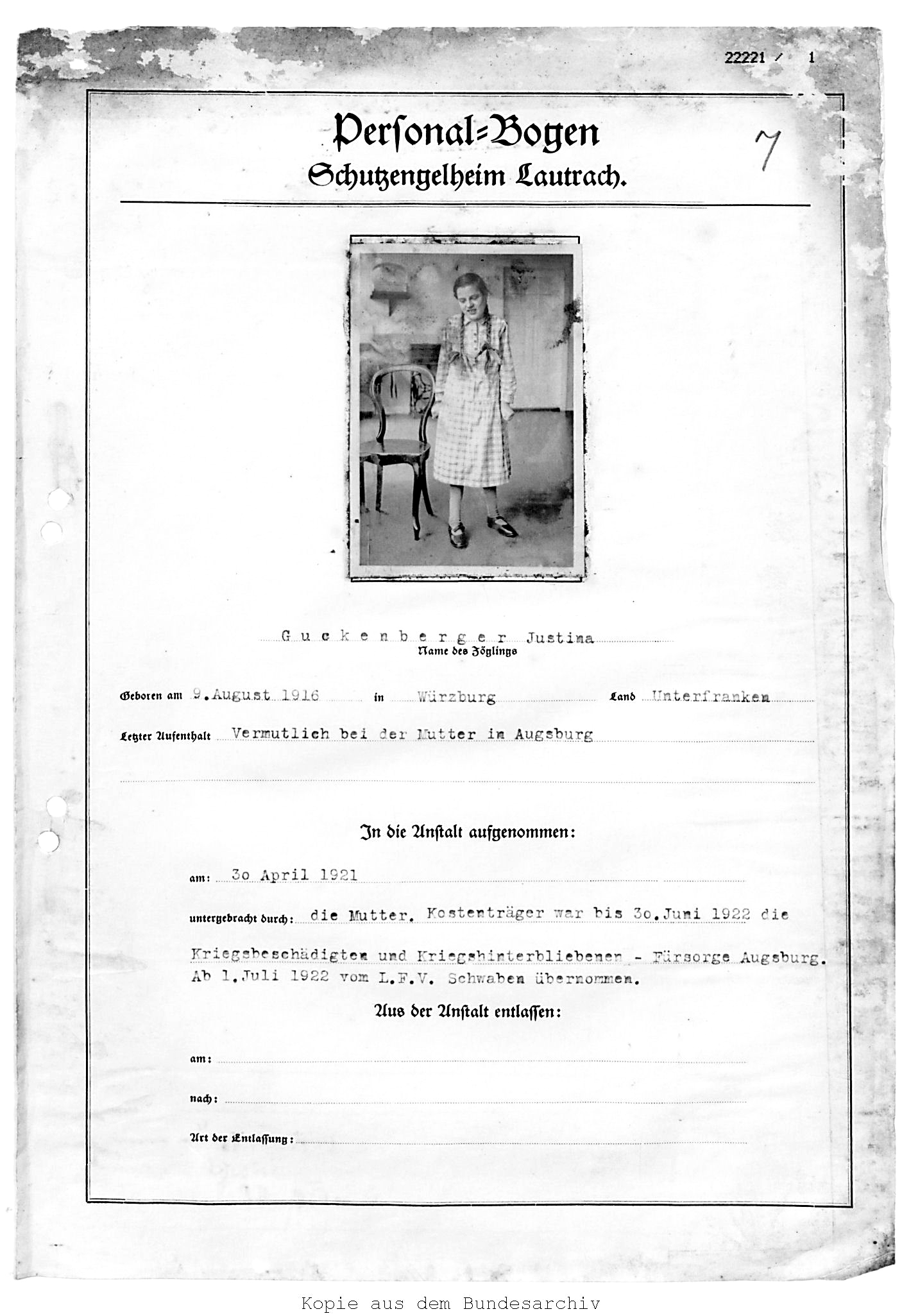 Justina ist bei ihrer Aufnahme in Deybach 5 Jahre alt. Die Kosten übernimmt bis zum 30.6.1922 die Kriegsbeschädigten- und Kriegshinterbliebenen-Fürsorge Augsburg, danach der Landesarmenverband Schwaben10 .