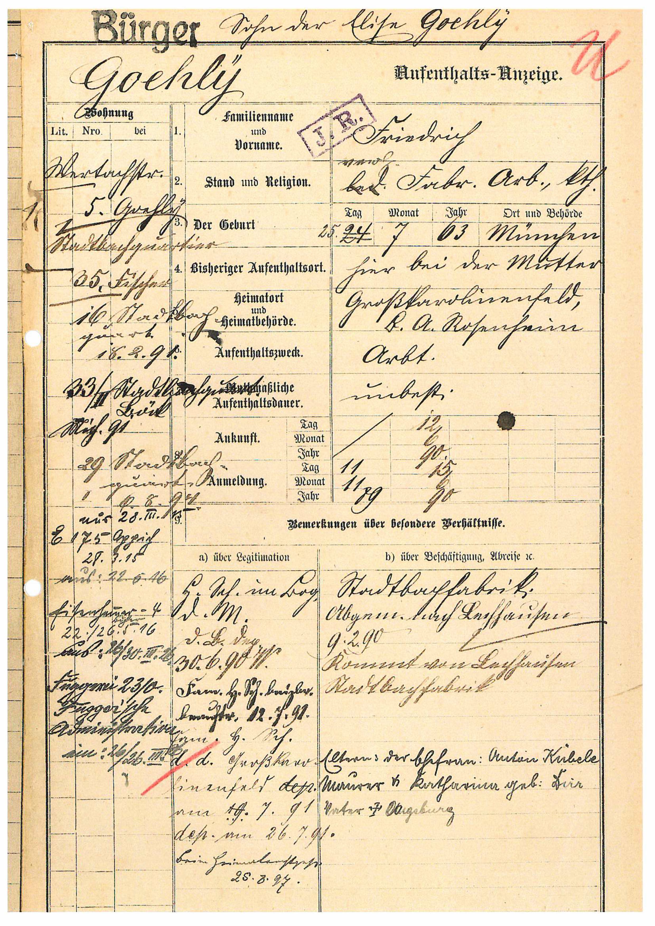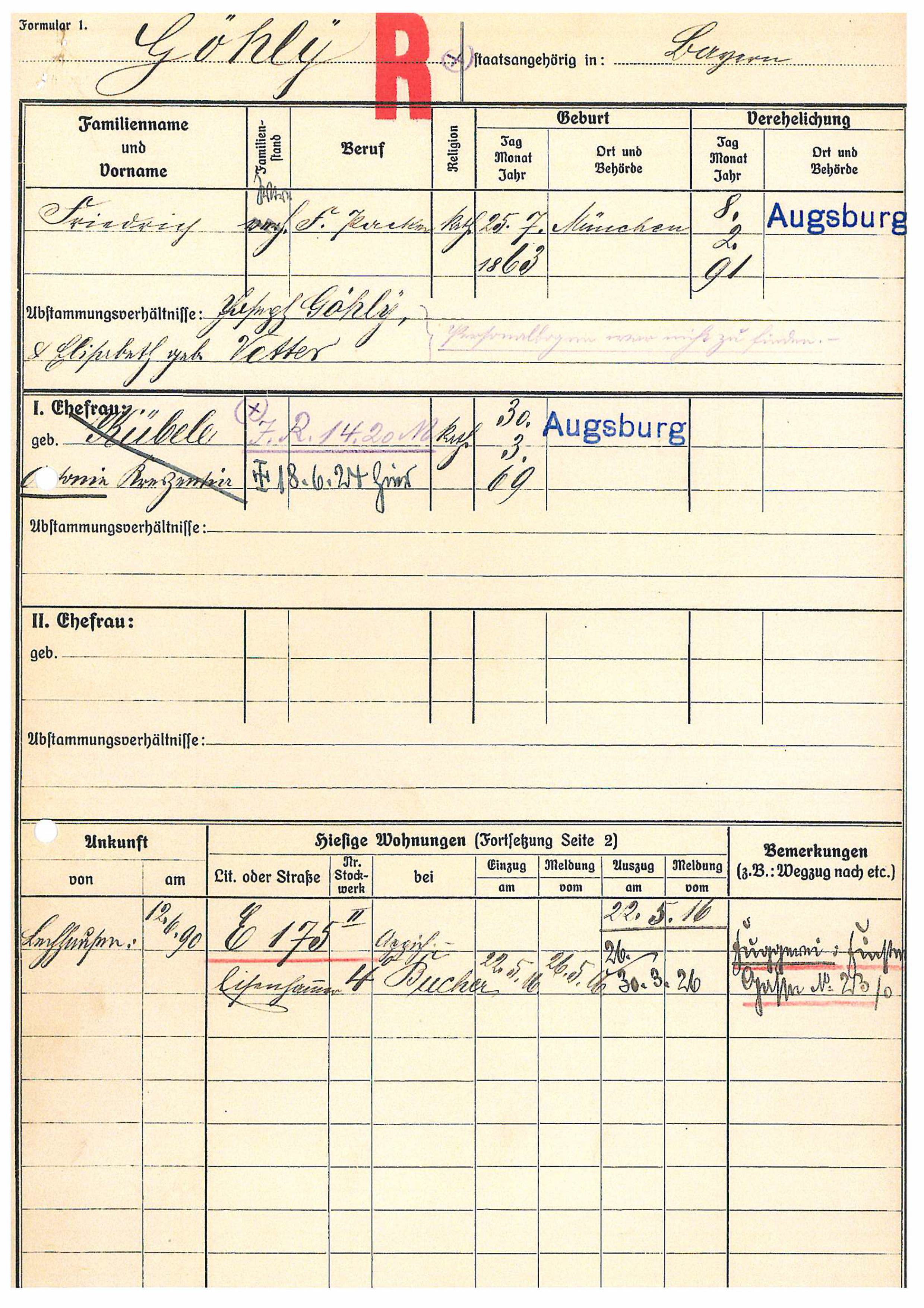 2. StAA MK 1 Friedrich Göhly und MB Friedrich Göhly 1863. Antonia Creszentia Kübele ist am 30. März 1869 in Augsburg geboren, Friedrich Göhly am 25.3.63 in München. Ihre Tochter Elise ist am 23. März 1899 geboren.