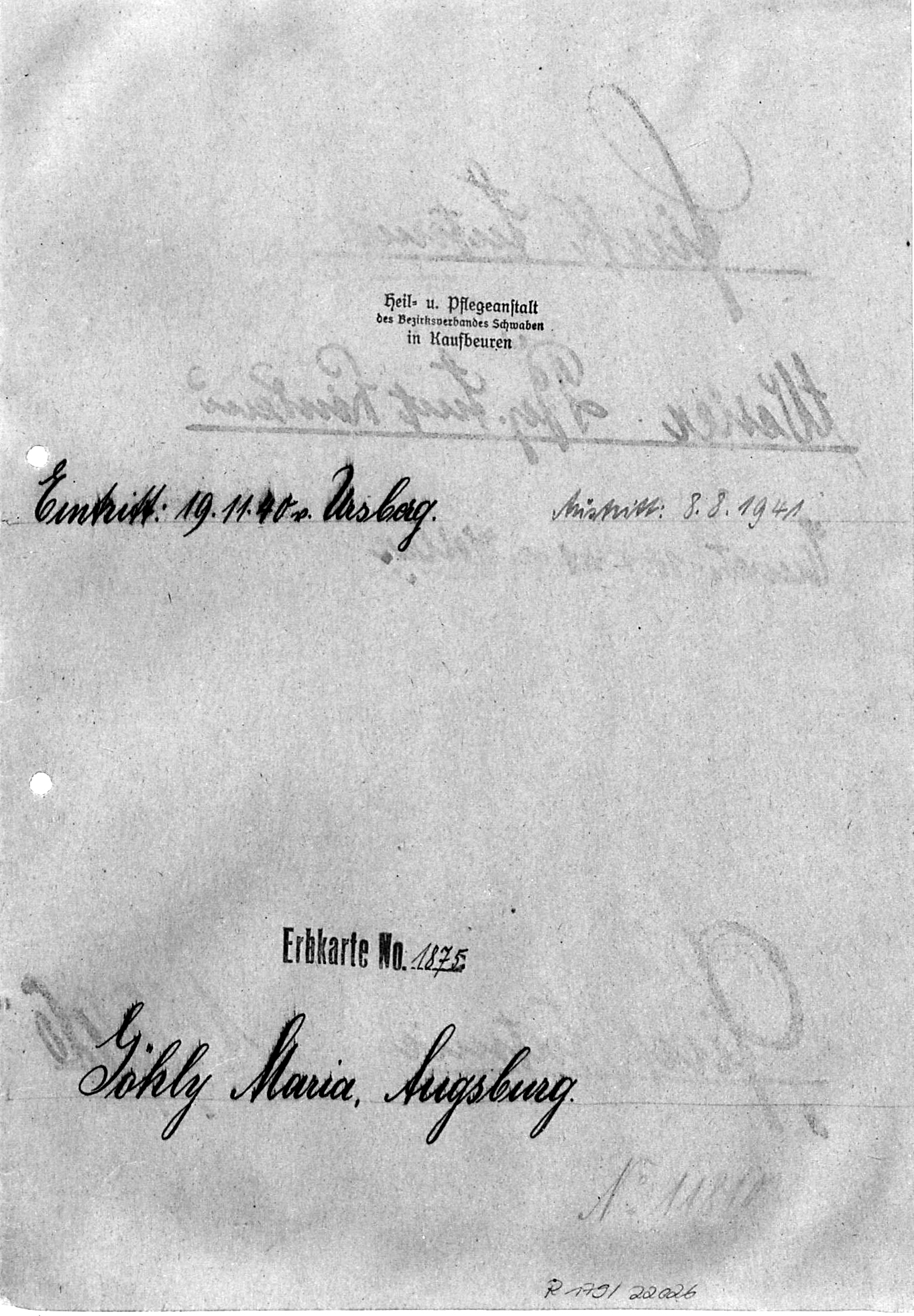 Am 19. November 1940 erfolgt die Verlegung von Patienten und Patientinnen aus Ursberg in die Heil- und Pflegeanstalt Kaufbeuren. Maria ist nun 36 Jahre alt. Sie hat keine Angehörigen mehr, sodass die Armenfürsorge in Augsburg die Kosten übernimmt.