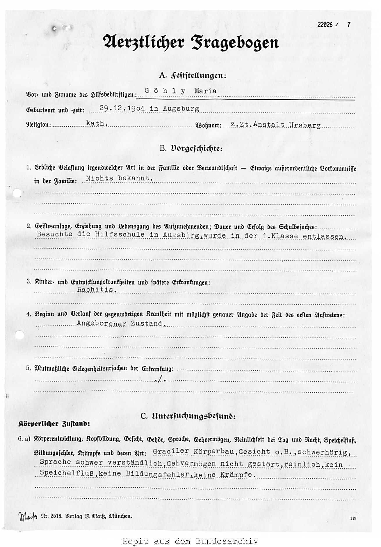 Maria Göhly wird am 31. Januar 1929 im Alter von 25 Jahren in die Heil- und Pflegeanstalt in Ursberg eingewiesen9 . Der Grund ihrer Aufnahme dort ist aus den Dokumenten nicht eindeutig ersichtlich. Der Bezirksarzt in Augsburg attestiert die Notwendigkeit der Heimunterbringung. Der Vater sei herzleidend und könne die Tochter nicht versorgen.