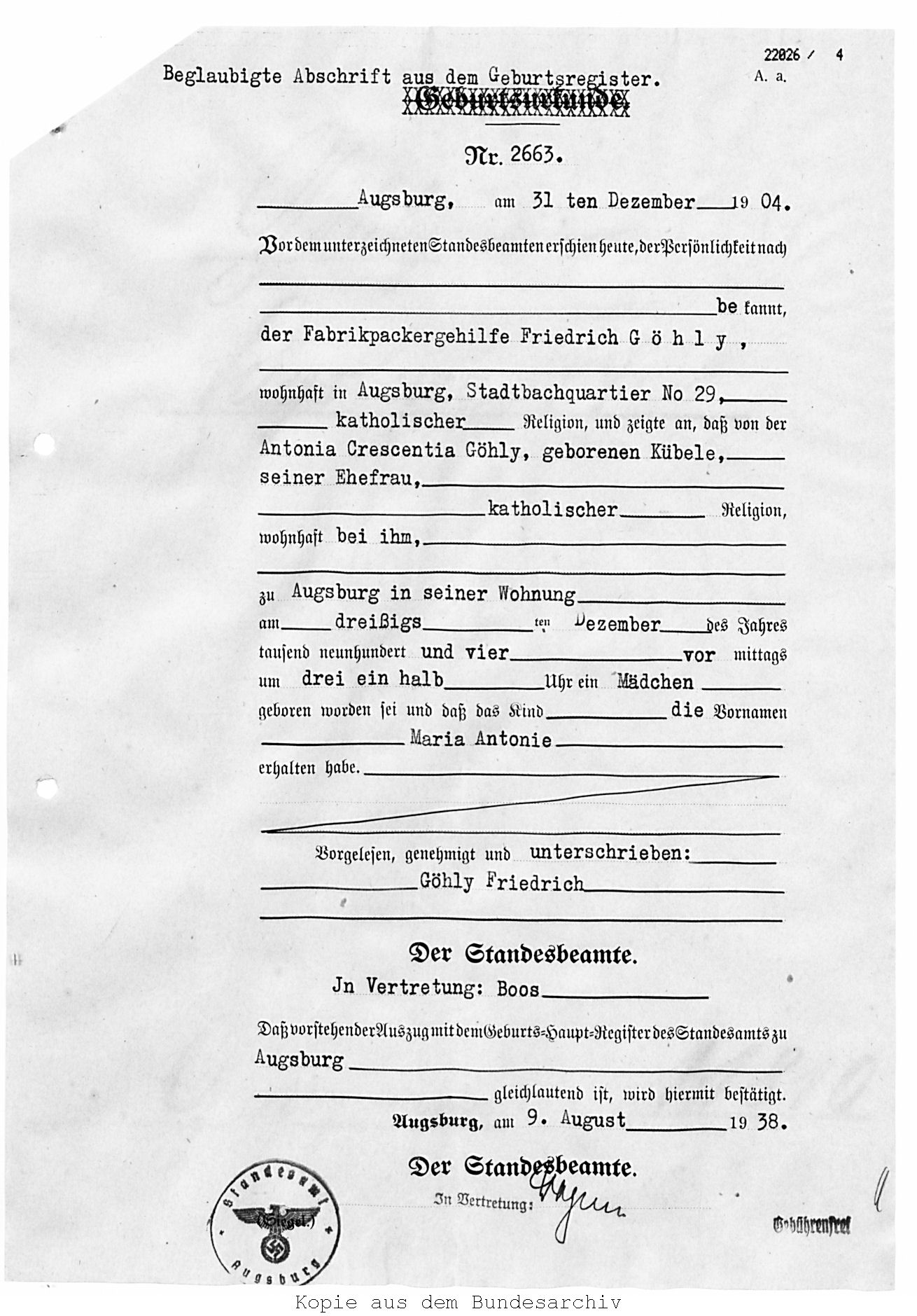 Göhly Maria Antonia, geb. 30.12.1904 in Augsburg,