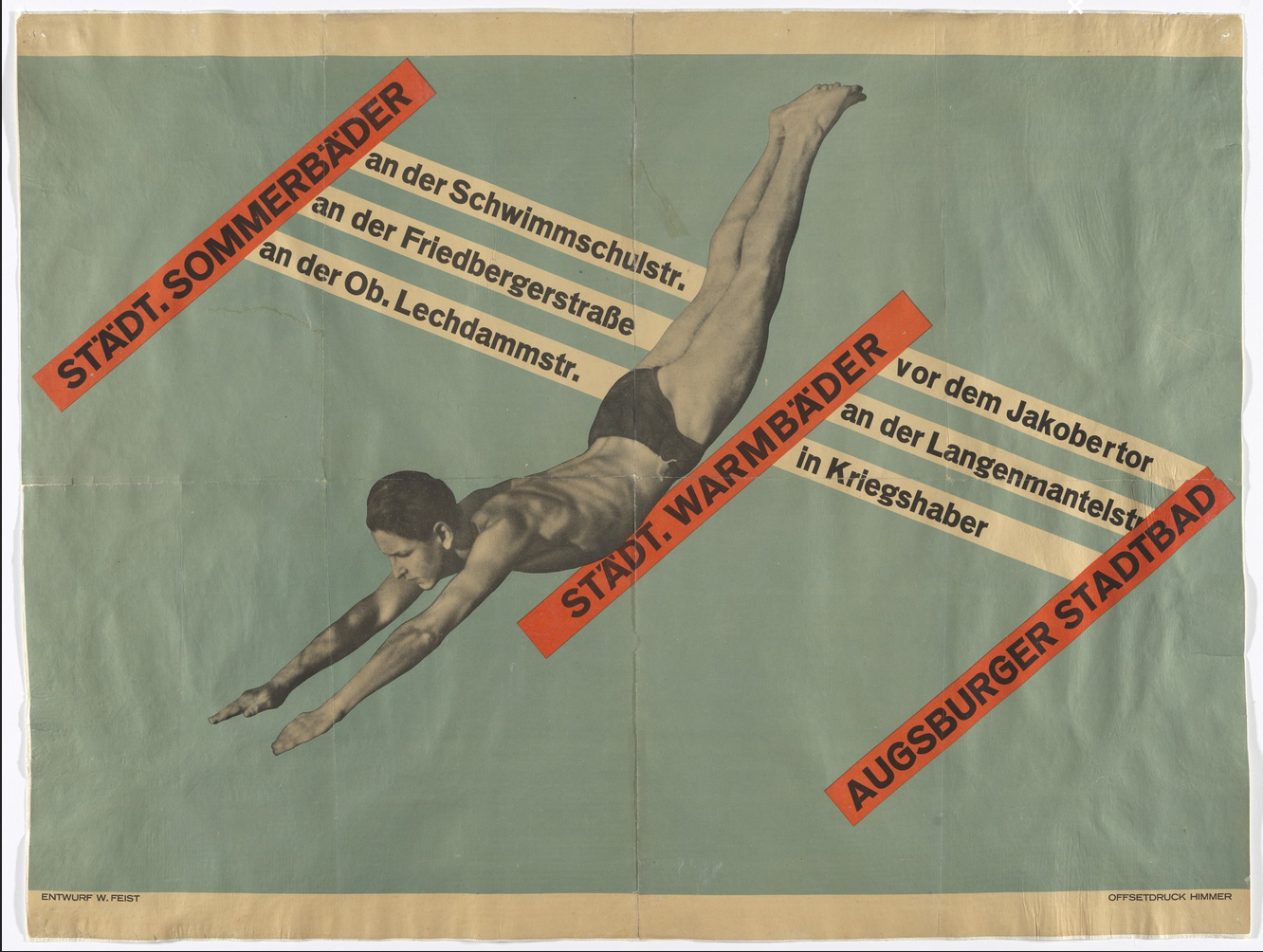 Von dem in Augsburg geborenen und aufgewachsenen Fotografen und Grafiker Werner David Feist hängt ein Plakat in der Ausstellung des New Yorker Museum of Modern Art. Es wirbt für die hiesigen städtischen Schwimmbäder, wurde 1928 von der Augsburger Druckerei Himmer gedruckt und ist hier nur noch Fachleuten bekannt. Auch die Kunstsammlungen haben kein Exemplar davon. Der Künstler hat Deutschland nicht freiwillig verlassen – als Jude durfte er die Schwimmbäder bald nicht mehr besuchen, für die er so wirksam geworben hatte.