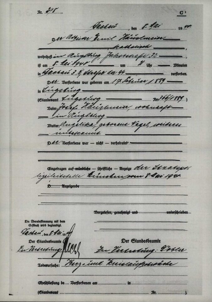 Nach gut zwei Monaten schlimmster Zwangsarbeit dort18 kommt Emil Häuslmeier am 5. März 1940 vom KZ Sachsenhausen19 ins KZ Dachau. Wiederum zwei Monate später ist er tot. Der Totenschein für Häftling Nr.36644 ist auf den 8.5.1940 ausgestellt. Zur Todesursache heißt es lapidar „Herz- und Kreislaufschwäche“, wie bei fast allen ermordeten Häftlingen des KZ Dachau.