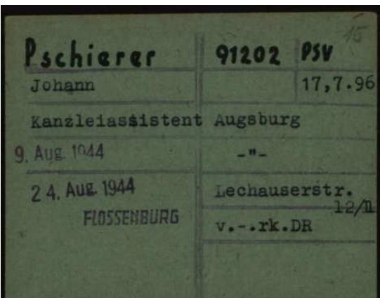 15 Tage später wird Johann Baptist Martin Pschierer ins KZ Flossenbürg (Kreis Neustadt an der Waldnaab) „verschubt“.18 Er hat die Häftlingsnummer 20211.