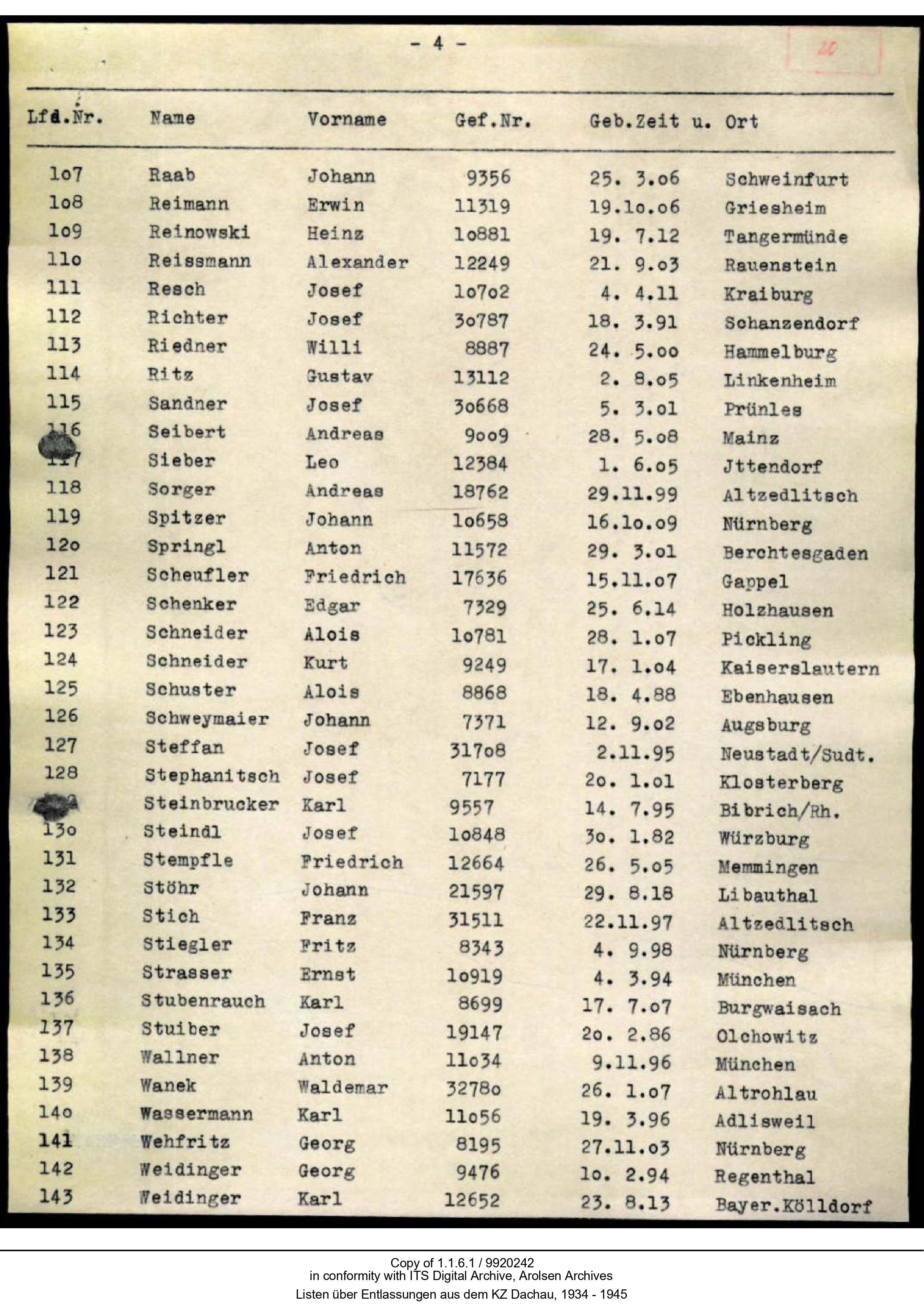 KZ Dachau, entlassene Häftlinge 20.4.39, darunter Schweymaier. (Arolsen Archives)