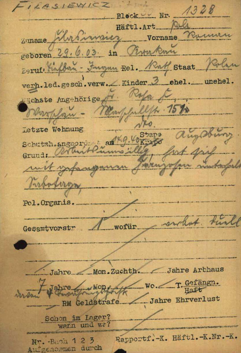 10. ITS Bad Arolsen, online Abfrage vom 26.10.2020: https://collections.arolsen-archives.org/archive/72226412/?p=1&s=Filasiewicz%20Roman&doc_id=72226413. Roman Filasewicz sei vorbestraft mit 7 Jahren Gefängnis, hiervon seien 4 auf Bewährungsfrist ausgesetzt, er habe verbotenen Handel (?) betrieben (? Hier ist die Handschrift unleserlich).