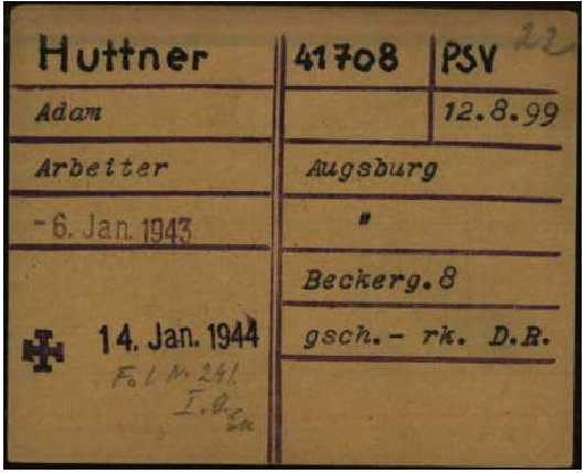 Von der Bäckergasse 18 aus, seinem letzten freien Wohnsitz in Augsburg18 , kommt er am 6. Januar 1943 ins KZ Dachau. Adam erhält die Gefangenennummer 41708. Als Grund seiner Einlieferung ins KZ ist PSV, also polizeiliche Sicherungsverwahrung angegeben. Mit dieser Bezeichnung werden wiederholt straffällig gewordene Personen ins KZ eingewiesen.19