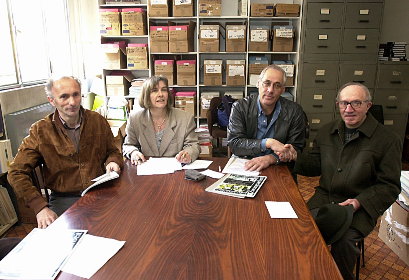 Aldo Moscatelli und der Neffe von Sign. Marelli treffen sich im Institut für Zeitgeschichte in Como mit Dr. Lehmann vom Paul-Klee-Gymnasium, der ihnen die Ergebnisse der Forschungsarbeit des PKG sowie eine symbolische „Entschädigung“ überreichte, 12.04. 2003. (v.l.n.r. Sign. Marelli, Maura Merazzi, Dr. Bernhard Lehmann und Aldo Moscatelli)