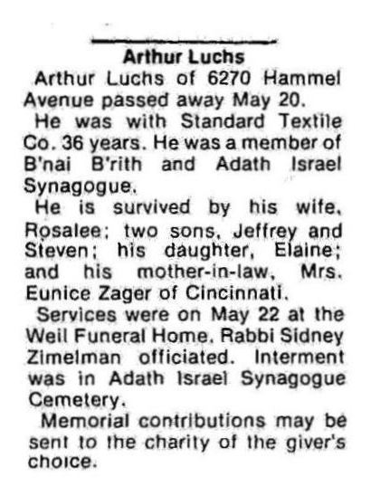 Ihr Bruder Arthur Luchs hat überlebt. Es ist möglich, dass er mit einem sog. Kindertransport nach England gelangt ist, wo er bis zu seinem 16. Lebensjahr wohnte. Gleich nach Ende des Kriegs hat Arthur, der damals in Leeds wohnte, versucht herauszubekommen, was mit seiner Familie passiert ist, und einen Antrag auf Bestätigung der Deportation seiner Familie bei der Vorgängerorganisation des ITS (International Tracing Service) gestellt.18 Arthur emigrierte dann in die USA, wo er bei seinem Onkel Karl Wollenreich und seiner Tante Betty Engel in Ohio wohnte. Dort schloss er dann die High School sowie das College ab, war als Sanitäter bei der U.S. Army tätig und arbeitet dann bei der Firma Standard Textile Co.19 Er heiratete Rosalee Zager, die beiden bekamen zwei Söhne. Arthur Luchs ist am 22.5.1981 gestorben.20