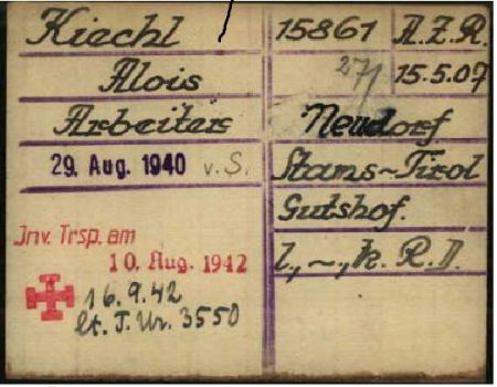 Alois Kiechl wird am 29. August 1940 ins KZ Dachau überstellt und erhält dort die Häftlingsnummer 15.861. Er gilt als asozial und wird nun unter der Kategorie AZR (Arbeitszwang Reich) geführt.