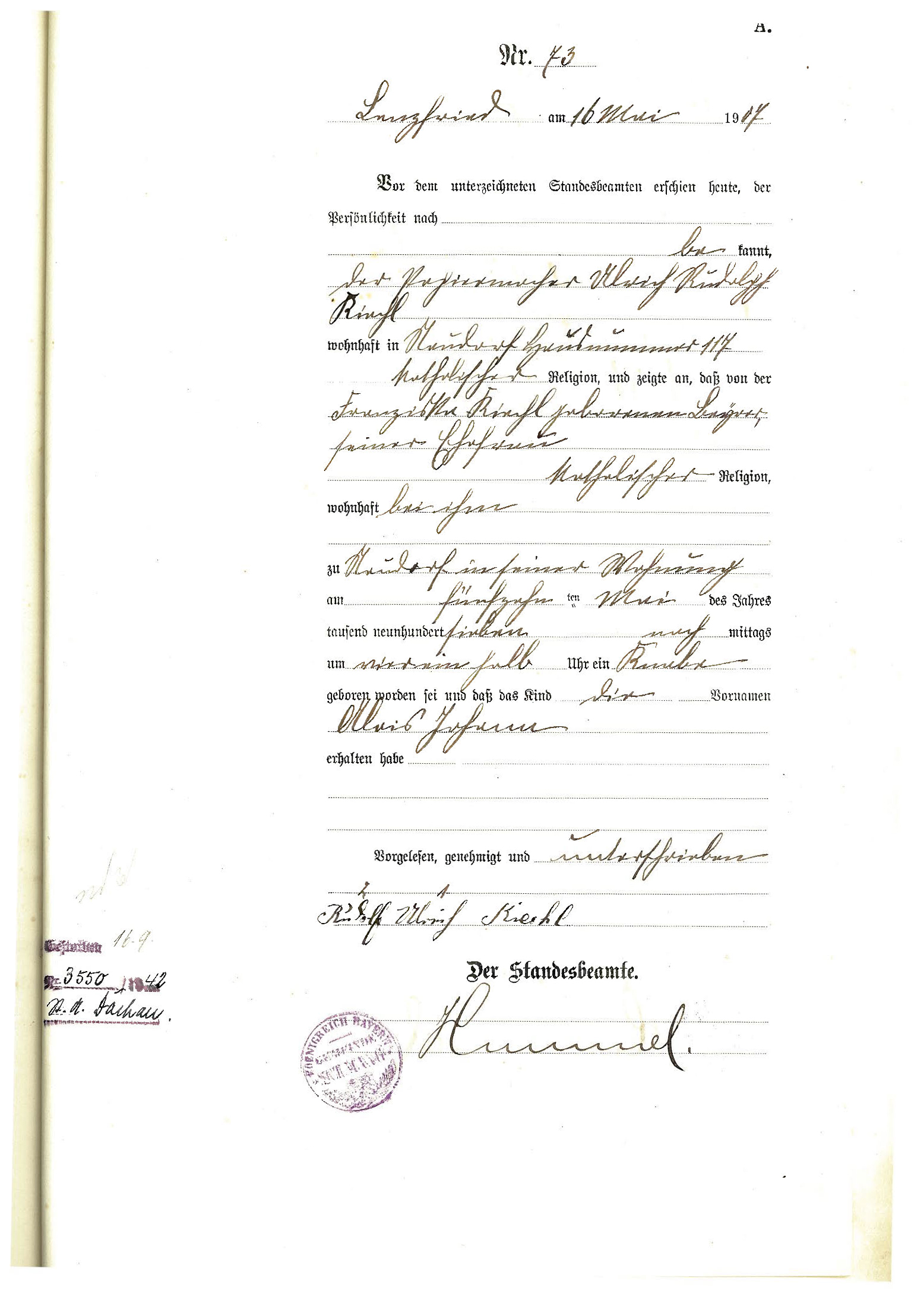 1. StAA, MK 2 Kiechl, Ulrich, 1881. Ulrich Rudolf Kiechl, Johanns Vater ist am 22.12.1881 in Hegge/Kempten geboren, verst. am 23.1.1966