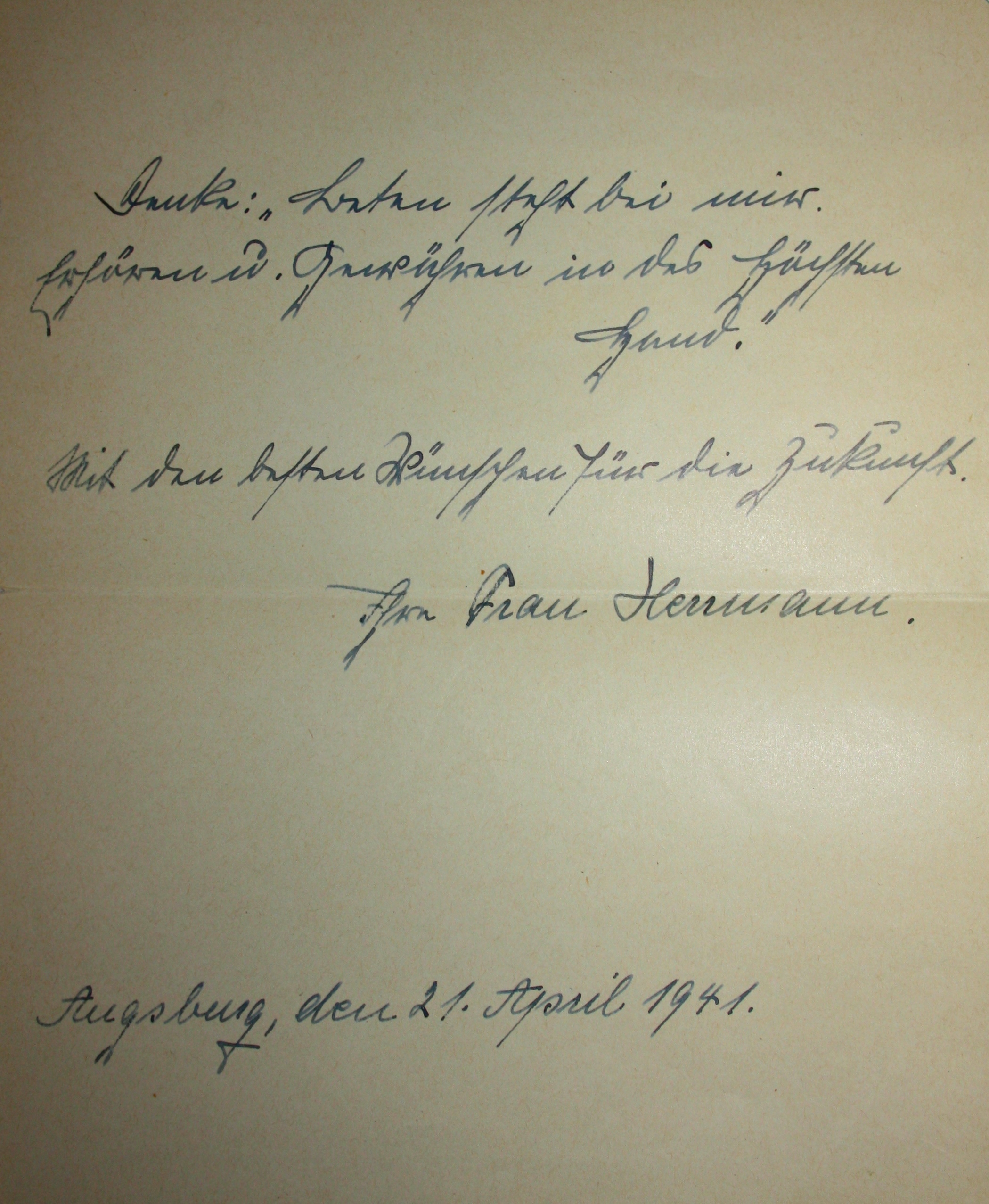 Margots Freundin Kundigunde Hutzmann, die sie selbst in dieser Zeit noch besucht hat, berichtete allerdings von einem sog. Judenhaus neben dem katholischen Friedhof, also von der Hermanstraße 10.6 Wohl zum Abschied trugen Cilli und ihre Tochter Margot sich im April 1941 in das Poesiealbum von Kunigunde Hutzmann ein. Cilli schrieb: „Denke: ‚Beten steht bei mir. Erhören u. Gewähren in des Höchsten Hand.‘ Mit den besten Wünsche für die Zukunft. Ihre Frau Herrmann.“