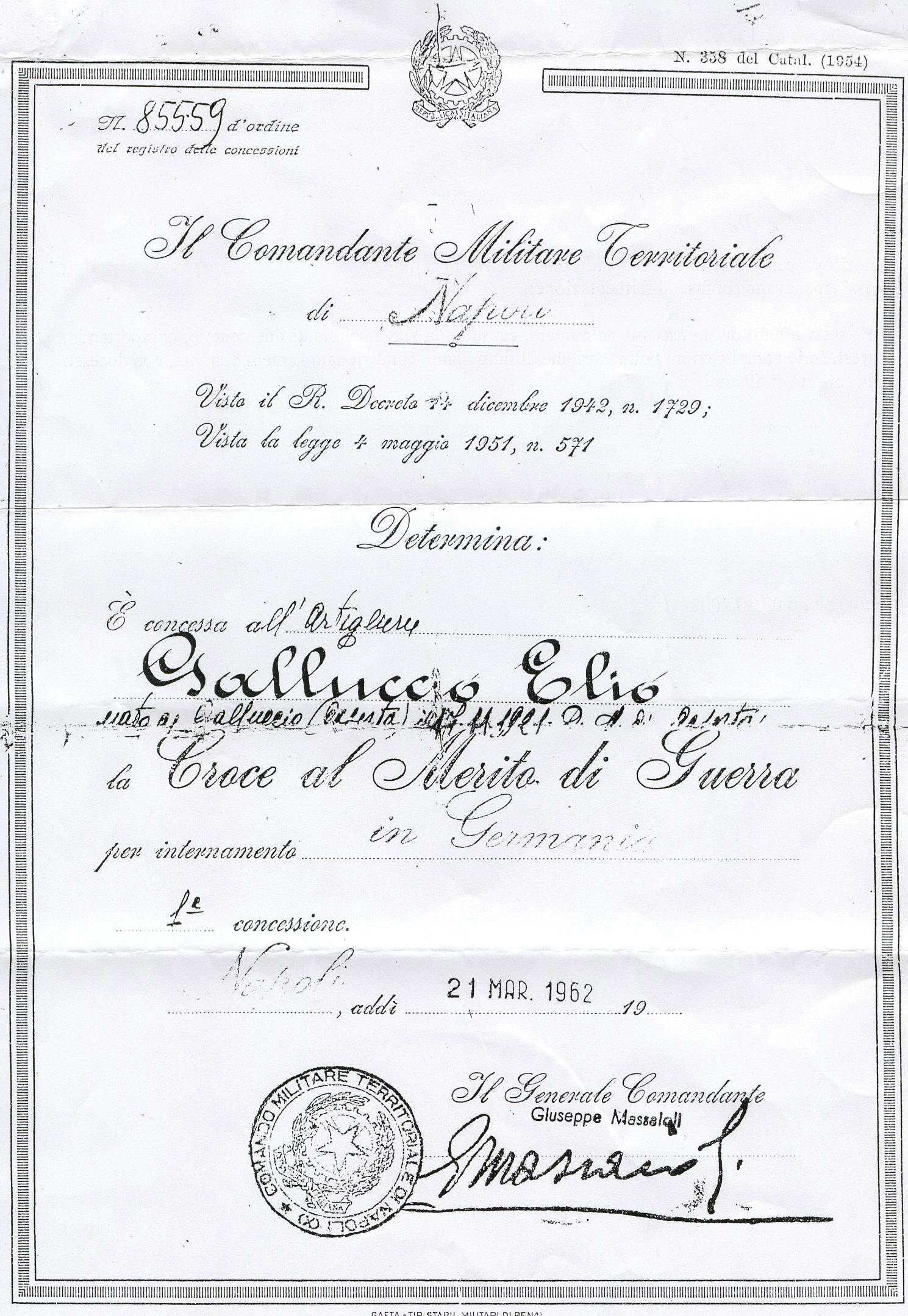 Der Staatspräsident zeichnete uns am 17. Juli 1951 mit folgender Begründung durch das Kriegsverdienstkreuz aus: „Zu Zeiten der Besetzung durch die Deutschen begleiteten sie die Aktivitäten der Partisanen in unmittelbarer Nähe der feindlichen Linie, sie führten gefährliche Missionen durch und bewiesen somit ihren Mut und ihre Treue zum Vaterland in der Gegend von Monte Camino (Napoli).“