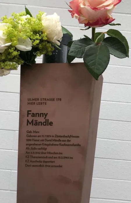 Der jüngste Sohn Fannys, Fritz oder auch Friedrich Sigmund Mändle, war ebenfalls Kaufmann. Deshalb reiste er häufig über kürzere Zeiträume durch Deutschland, kehrte aber immer wieder nach Augsburg zurück.40 Er starb am 29.3.1926 im Alter von 24 Jahren in Kriegshaber, im Haus Ulmer Straße 17841 , und wurde auf dem örtlichen Jüdischen Friedhof bestattet.42