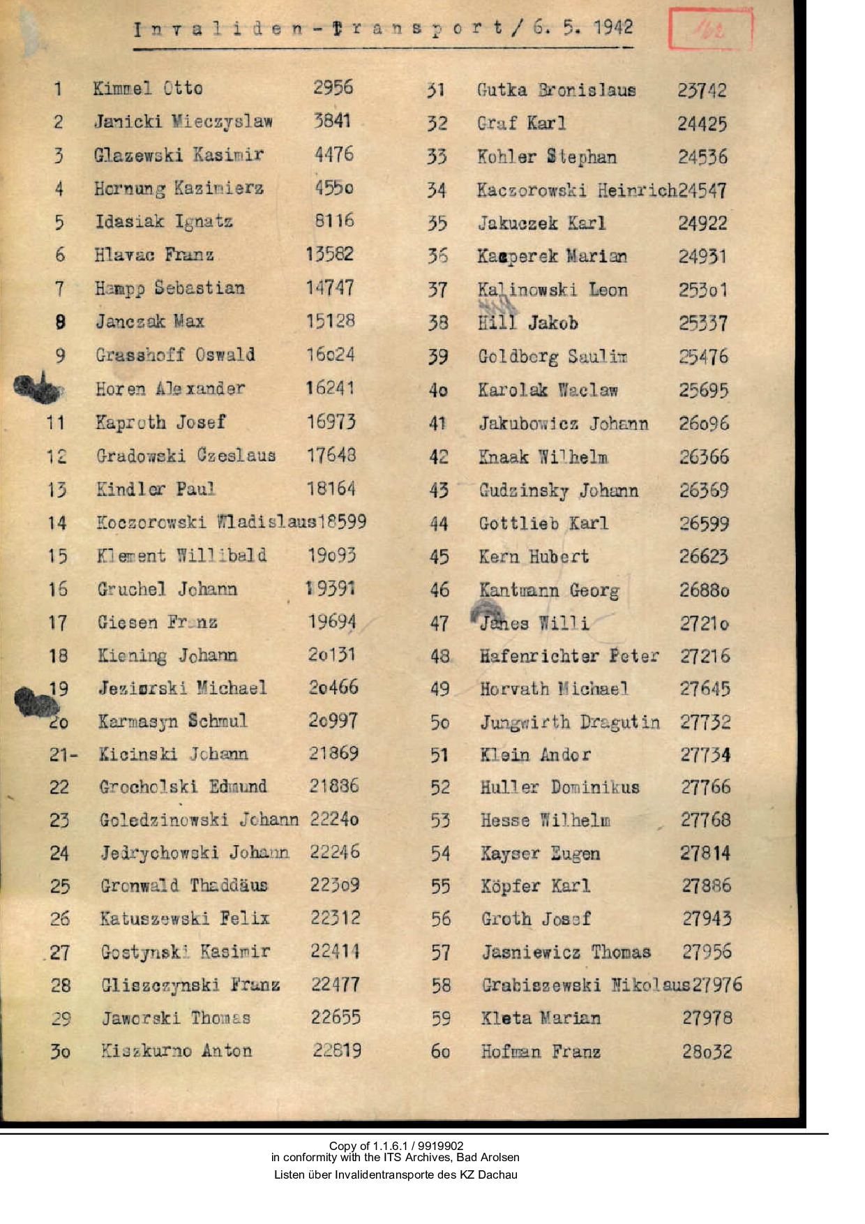 Die erste der 5 Wellen (15.1.–3.3.42) umfasste 15 Transporte mit 1.452 Häftlingen, die zweite (4.5.–11.6.42) sechs Transporte mit 561 Häftlingen, die dritte (10.–12.8.42) zwei Transporte mit 181 Häftlingen, die vierte (7.–14.10.42) drei Transporte mit 330 Häftlingen, die fünfte (27.11.–8.12.42) sechs Transporte mit 69 Häftlingen.