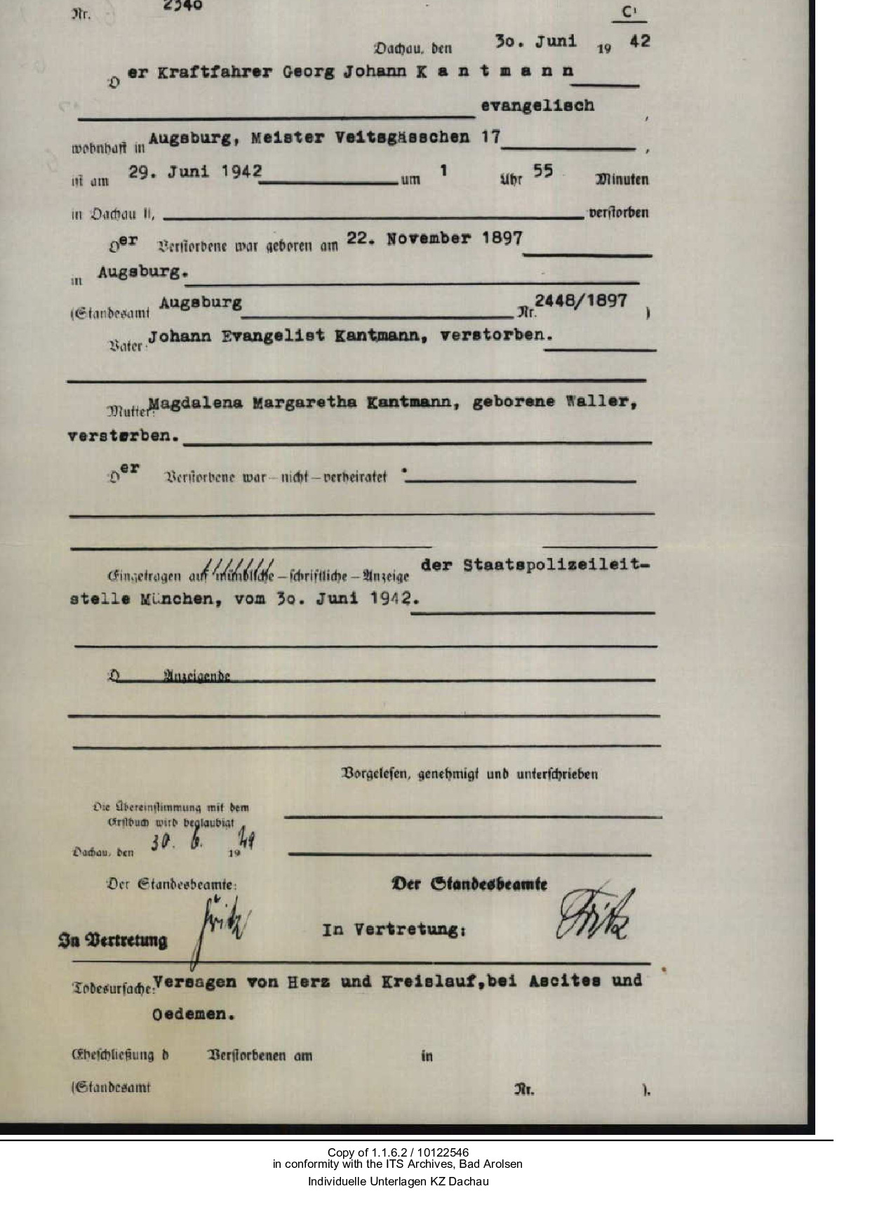 Die Behörden teilen seinen Schwestern Sofie Margarete und Babette mit – die Eltern sind in der Zwischenzeit nicht mehr am Leben18 –, dass Georg am 29. Juni 1942 in Dachau verstorben sei. Als Todesursachen werden in der Todesurkunde Versagen von Herz- und Kreislauf bei Ascites und Ödemen angegeben.
