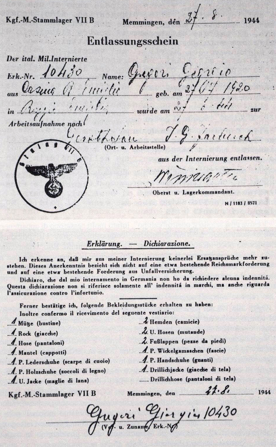 Nach Zwangsarbeit in Grunau und Sonthofen wird er im August 1944 vom Stalag Memmingen VIIB mit anderen Häftlingen abkommandiert zur Zwangsarbeit in Gersthofen. Von Buchloe läuft er zu Fuß nach Gersthofen, wo er anfangs in Baracken ohne Betten untergebracht ist. Die Essensrationen sind unzureichend und schlecht, wie er in seinem Tagebuch vermerkt. Er muss mit den anderen IMIs (Italienische Militär-Internierte) Luftschutzunterstände bauen. Nach 4 Tagen müssen sich die IMIs einem Leistungstest unterziehen, um ihre Einsatzmöglichkeiten zu taxieren. Jetzt werden die IMIs in einer Baracke mit Stockbetten untergebracht. Ganz in der Nähe hausen die russischen Kriegsgefangenen. Sonntags ist arbeitsfrei, die Zeit wird genutzt für Waschen, Nähen, Flicken, Briefe schreiben.