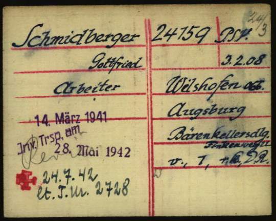 Arolsen Archives, Schmidberger Gottfried ID 10747110; 10288676; 10288677; 86533705; 130429039, abgerufen am 20.6.25