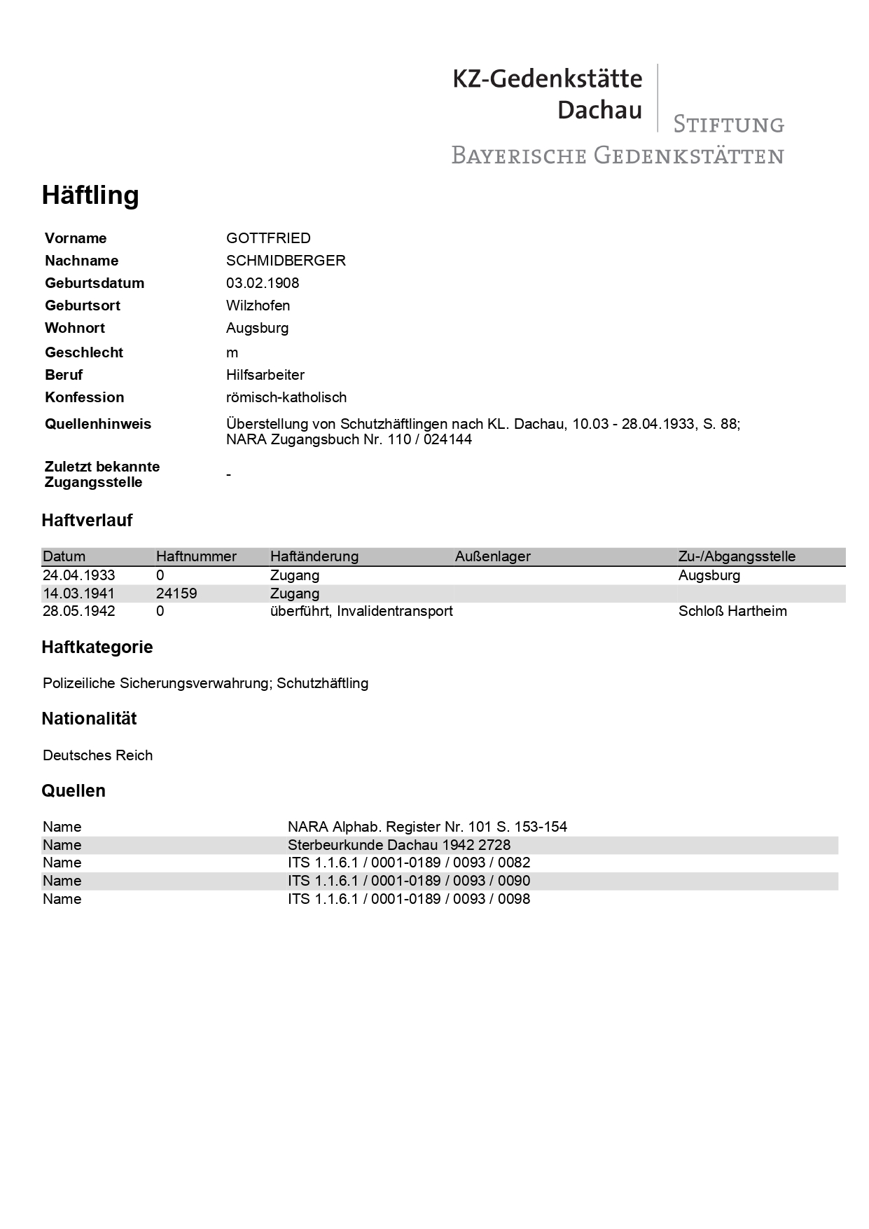 KZ Gedenkstätte Dachau, Schmidberger Gottfried