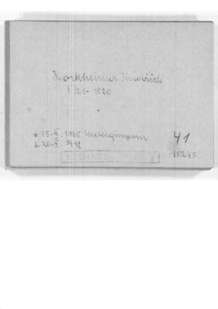 Heinrich Horkheimer, ursprünglich Jindřich, vgl. Arolsen Archives, 11422001, 08.11.2021. https://collections.arolsen-archives.org/archive/1-1-42- 2_11422001/?p=1&doc_id=5049728 wurde am 15. März 1865 in Untergimpern vgl. 08.11.2021 https://stevemorse.org/germanjews/germanjews.php?=&offset=2051 bei Neckarbischofsheim im heutigen Baden-Württemberg geboren.