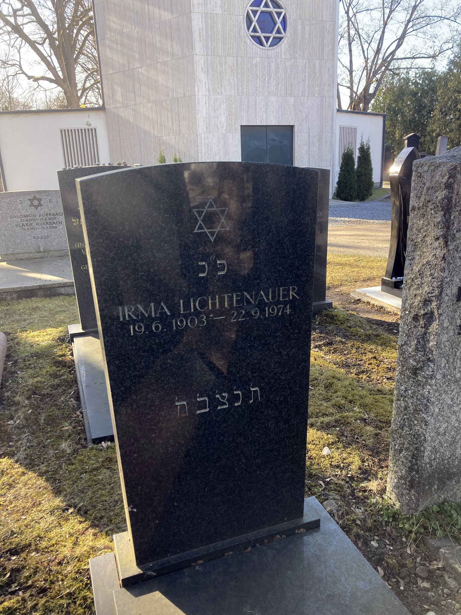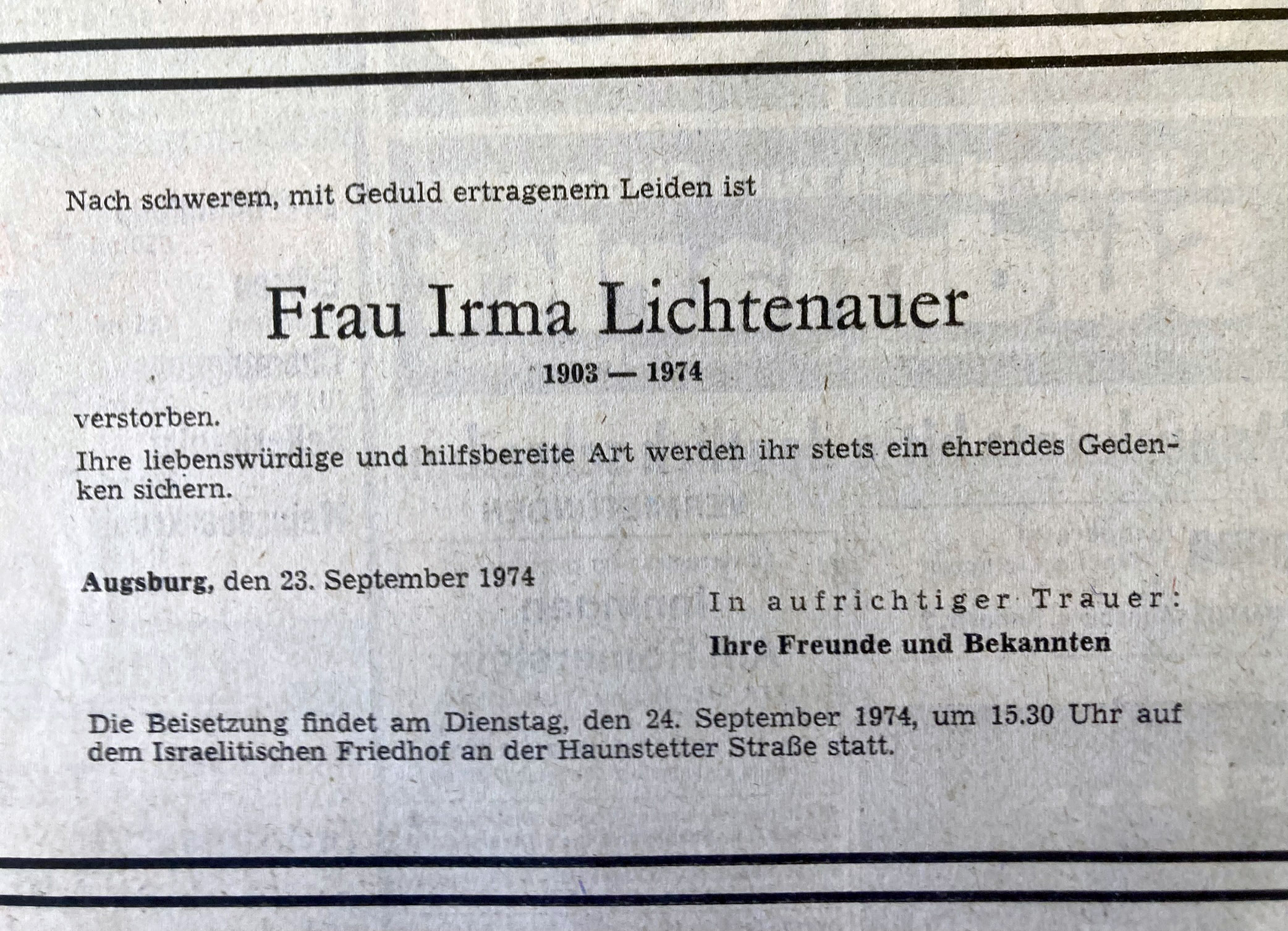 Im März 1974 zog Irma Lichtenauer von der Maximilianstraße 71 in den Bungalow 24 des Servatius Seniorenheims in der Fritz-Hintermayr-Str. 7. Sie starb am 22.9.1974 im Vincentinum in Augsburg36 und wurde auf dem Israelitischen Friedhof in Augsburg bestattet. Rabbiner Grünewald aus München hielt die Trauerfeier. Die Grabstätte liegt im südlichen Teil, Reihe S 28, Grab 8.37 Irma Lichtenauer wurde 71 Jahre alt. In der Todesanzeige wird ein schweres Leiden genannt.38