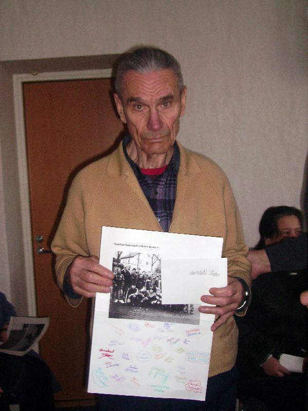 Ich übergebe Iwan das Geld, das meine Geschichtsklasse 7c für ihn gesammelt hat, gemeinsam mit einem Bild der Klasse. Iwan ist hocherfreut, die Tränen stehen ihm in den Augen. „Sagen Sie viele liebe Grüße an Ihre Klasse, es ist wichtig, dass die jungen Menschen unser Schicksal nie vergessen! Spassiba!“ Die anderen anwesenden Opfer sind von der Initiative der Klasse 7c des Paul-Klee-Gymnasiums so gerührt, dass sie alle ein Foto von der Klasse haben wollen.