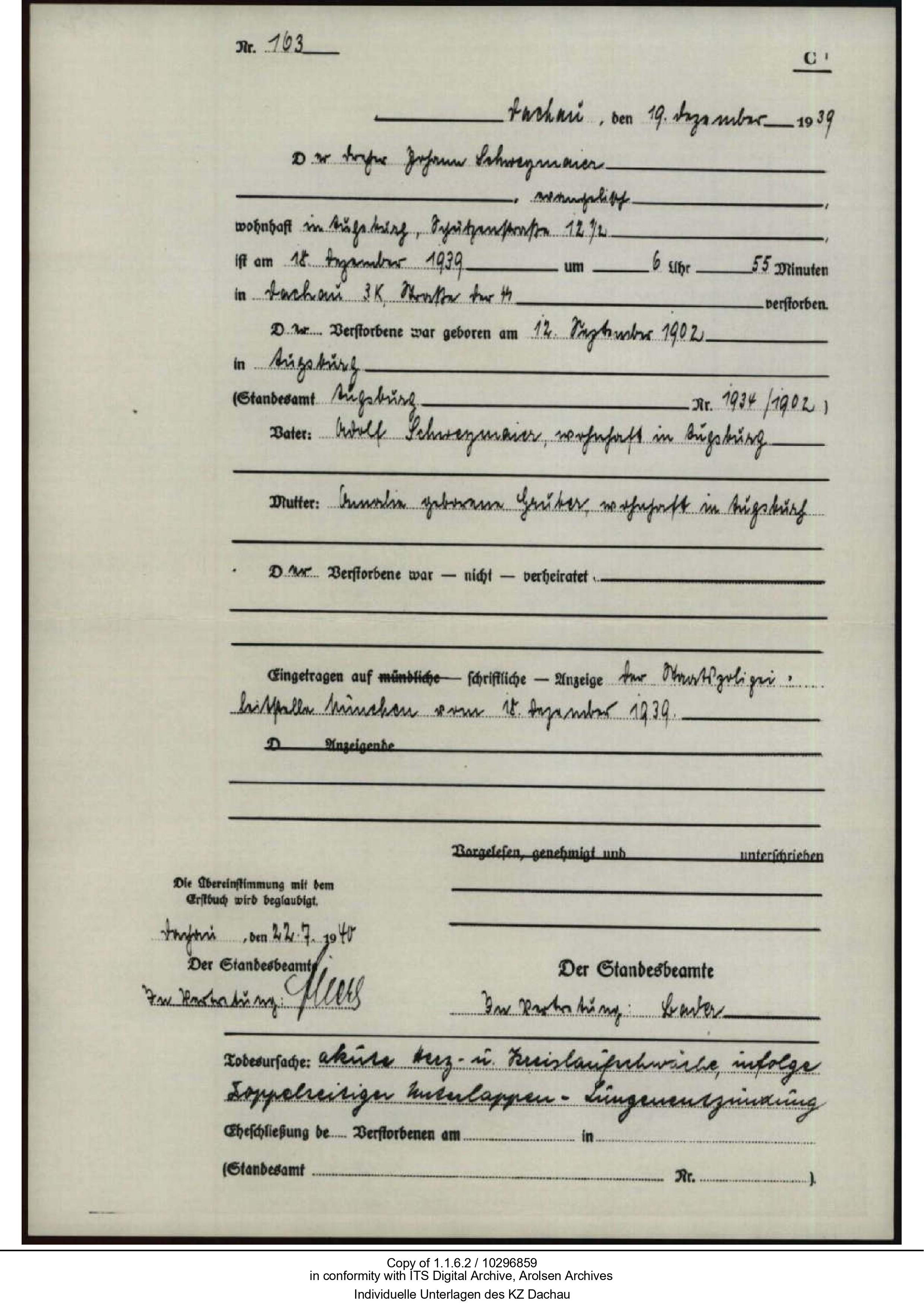 Nur 4 Monate später verstirbt Johann Schweymaier am 18. Dezember 1939 als Häftling Nr. 34864 im KZ Dachau.21 Der Totenschein konstatiert als Todesursache akute Herz- und Kreislaufschwäche infolge einer doppelseitiger Unterlappen- Lungenentzündung.22