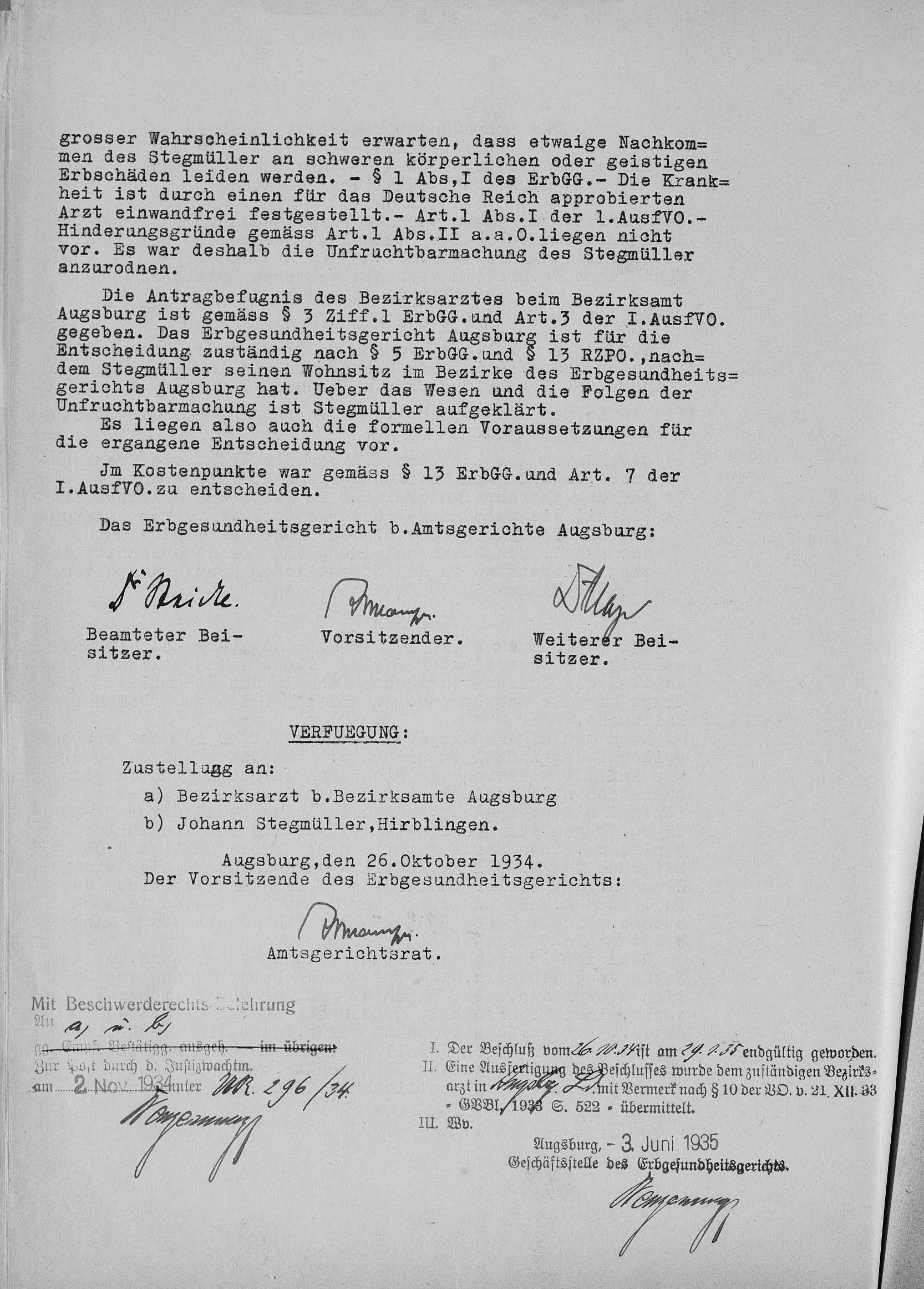Unter Berufung auf Art. 1 Abs. 2 Ziffer 4 des Erbgesundheitsgesetzes kommt das Erbgesundheitsgericht Augsburg unter Vorsitz von Amtsgerichtsrat Anhäußer, assistiert von Landgerichtsarzt Obermedizinalrat Dr. Steidle und dem Kinderarzt Dr. Wilhelm Mayr, am 26. Oktober 1934 zum einstimmigen Beschluss, Johann Stegmüller unfruchtbar zu machen. Es sei mit „großer Wahrscheinlichkeit zu erwarten, dass etwaige Nachkommen des Stegmüller an schweren körperlichen oder geistigen Erbschäden leiden werden.“ Die Krankheit sei „durch einen für das Deutsche Reich approbierten Arzt einwandfrei festgestellt“20 .