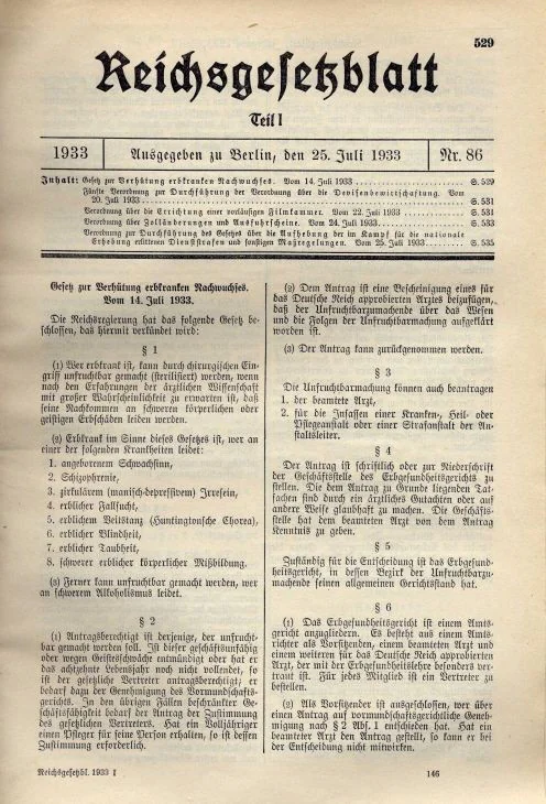 „Wer erbkrank ist, kann durch chirurgischen Eingriff unfruchtbar gemacht (sterilisiert) werden, wenn nach den Erfahrungen der ärztlichen Wissenschaft mit großer Wahrscheinlichkeit zu erwarten ist, dass seine Nachkommen an schweren körperlichen oder geistigen Erbschäden leiden werden … Erbkrank im Sinne dieses Gesetzes ist, wer an einer der folgenden Krankheiten leidet:
