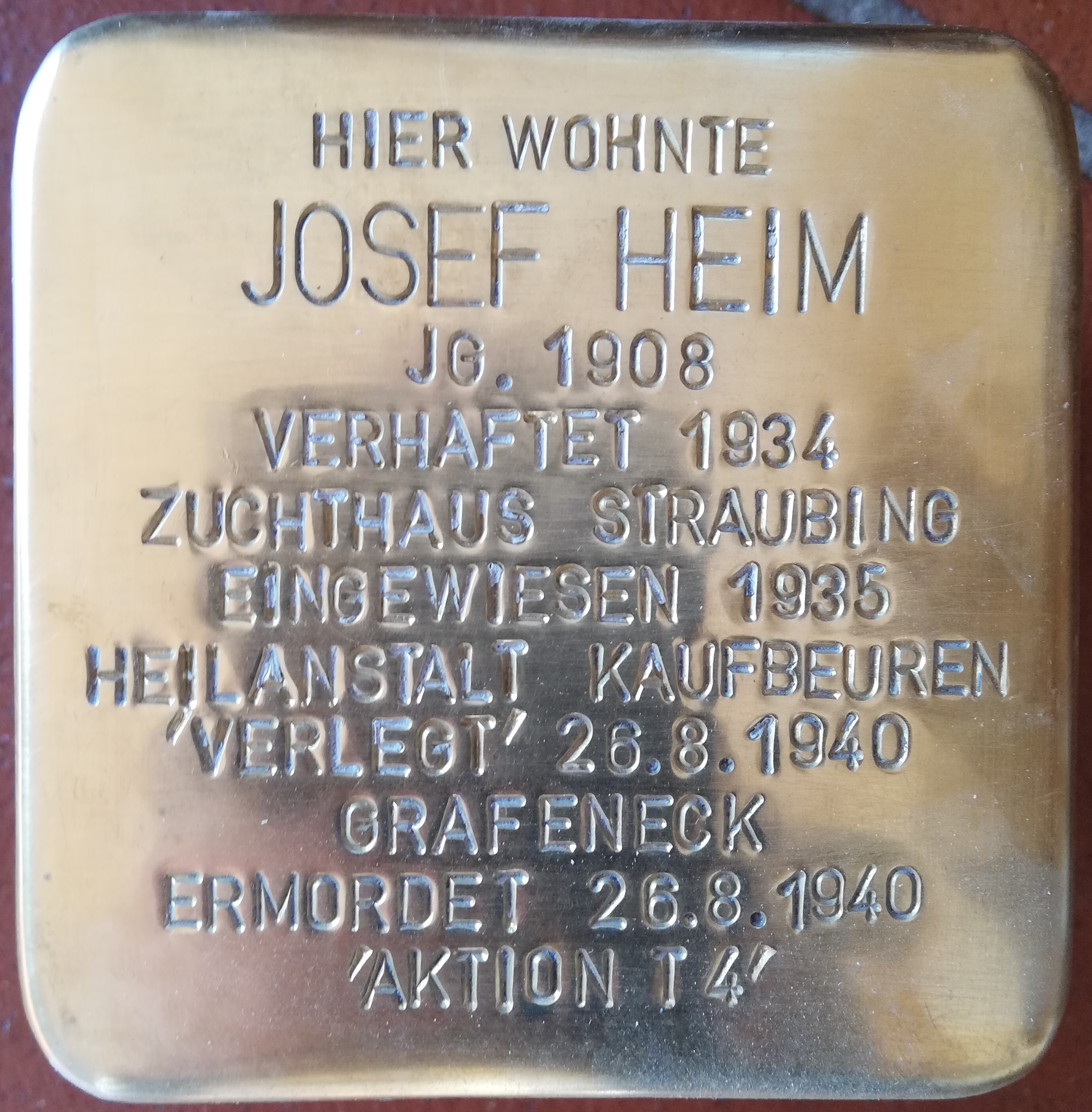 Josef Heim wird am 26. August 1940 im Alter von 32 Jahren von den Nazischergen auf grausame Weise in der Tötungsanstalt Grafeneck mit Gas ermordet.33