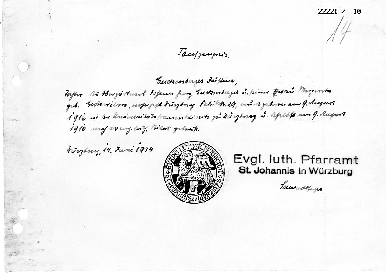 Justina Guckenberger erblickt am 9. August 1916 in der Universitätsfrauenklinik zu Würzburg das Licht der Welt und wird noch am gleichen Tag nach evang.-luth. Ritus getauft1 .