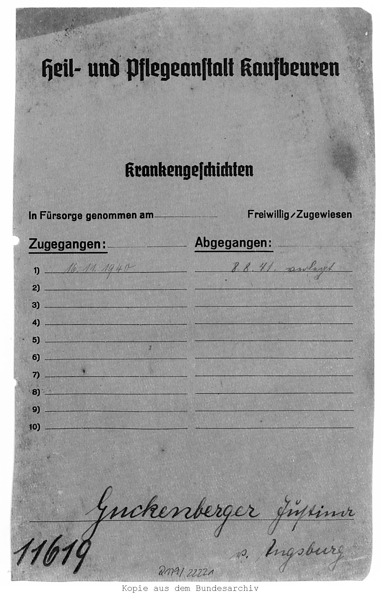 Der Bogen der Krankheitsgeschichte von Justina Guckenberger in Kaufbeuren-Irsee umfasst nur 1 Seite und weist 2 relevante Einträge auf (25.11.40; 15.3.41). Den Einträgen des leitenden Oberarztes von Kaufbeuren-Irsee ist lediglich zu entnehmen, dass sich Justinas Gesundheitszustand nicht geändert hat. Der Eintrag vom 8.8.41 lautet lapidar: „wird verlegt“.