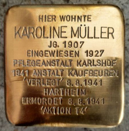 Zusammen mit weiteren 142 Frauen wird Karoline Balbina Müller, darunter die Augsburgerinnen Therese Baumeister, Johanna Baur, Maria Egger, Maria Eichberger, Walburga Federhofer, Maria Garke, Maria Göhly, Anna Göldl, Barbara Hölzle, Aloisia Kempter, Balbina Müller, Maria Müller, Pfiffner Agnes, Ragner Anna, Liselotte Sack, Wilhelmine Schindler, Rosa Schlosser, Walburga Schlosser, Maria Schmucker, Karoline Schweizer, Martha Treichel, Maria Wiesenbarth, Maria Wörle, in die Tötungsanstalt nach Schloss Hartheim bei Linz deportiert und dort vergast.16 Es war der letzte Transport, danach wurde das Tötungsprogramm im Rahmen der Aktion T4 zwar beendet, das Morden wird allerdings nun in den Heil- und Pflegeanstalten fortgesetzt.