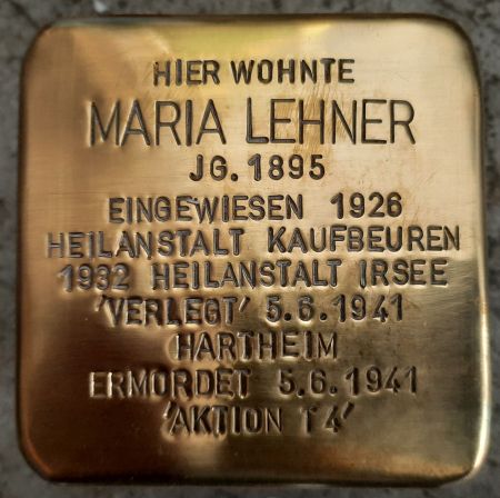 Der Anstaltsleiter Dr. Faltlhauser bestätigt am 2. Mai 1938 dem Amtsgericht in Augsburg, „dass Maria Lehner völlig geschäftsunfähig ist. Es sind bei ihr die Voraussetzungen für die Errichtung einer Pflegschaft gemäß § 1910 BGB gegeben. Eine Verständigung mit ihr ist nicht möglich. Gez. Falthauser“18
