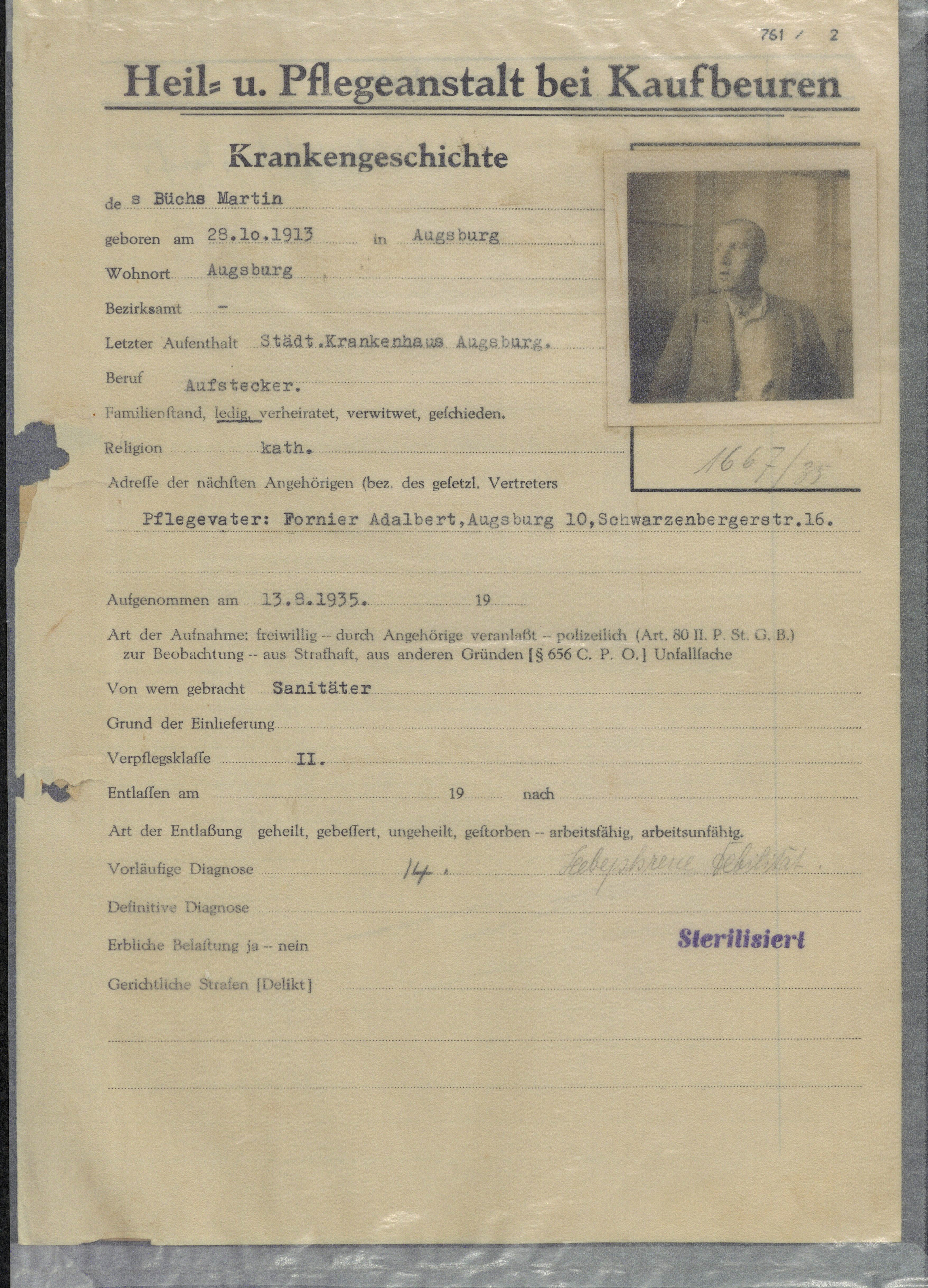 13. Im ärztlichen Bericht heißt es: Der an hebephrener Debilität leidende Büchs Martin, geboren am 29.10.1913, Geburtsort: Augsburg, wohnhaft in Augsburg [...