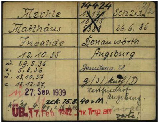Im Januar 1942 erfolgte der erste Invalidentransport nach Hartheim. Matthäus Merkle wird am 17.2.1942 mit der „ersten Welle“ bei einem der 15 Transporte nach Hartheim verbracht.