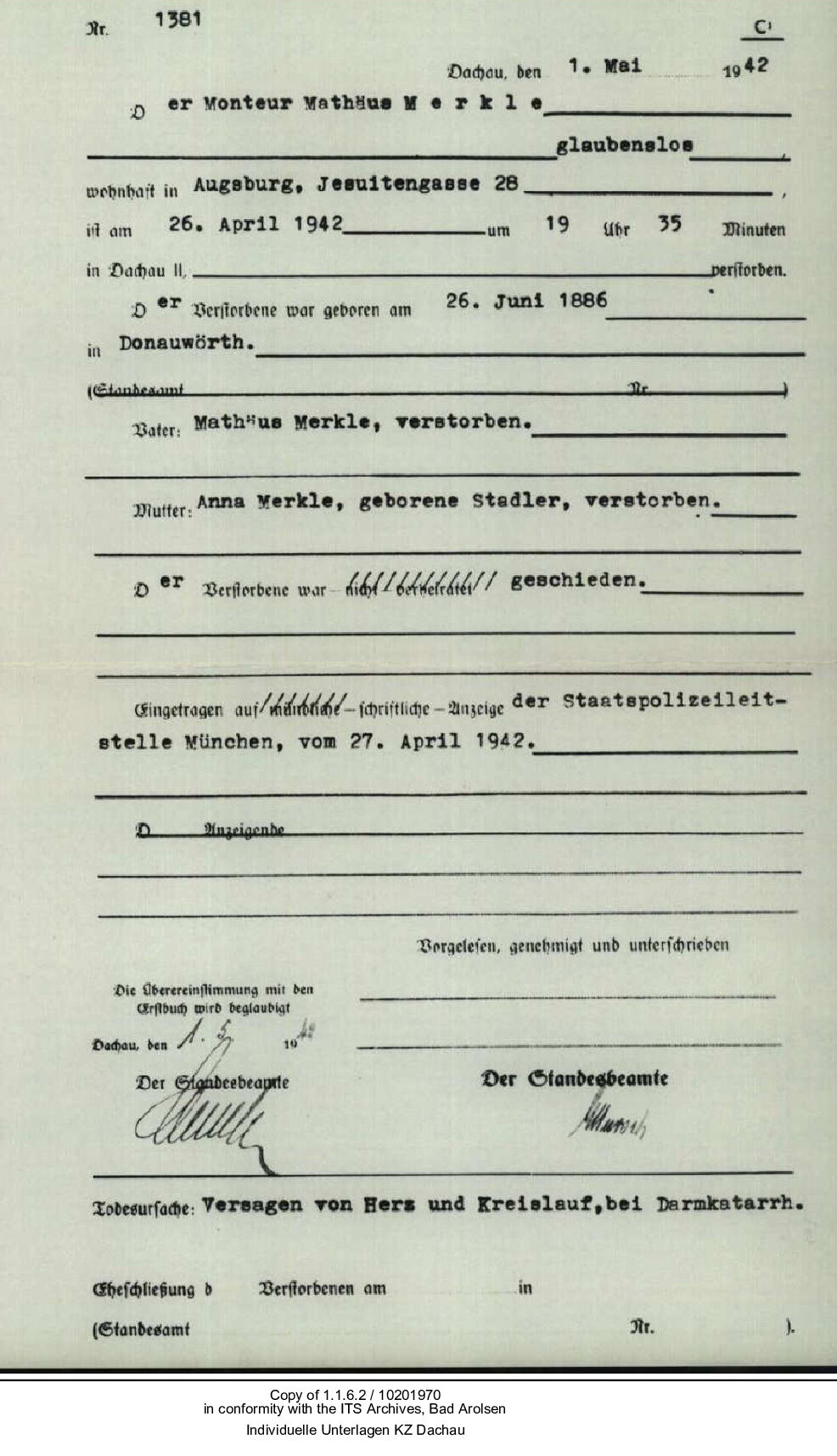 Den Verwandten wird mitgeteilt, dass Matthäus Merkle am 26. April 1942 in Dachau an „Versagen von Herz- und Kreislauf bei Darmkatarrh“ verstorben sei.18 Todesursache und Todeszeitpunkt sind frei erfunden, um die wahren Umstände der sogenannten „Invalidentransporte“ und die Morde an den Häftlingen zu vertuschen.