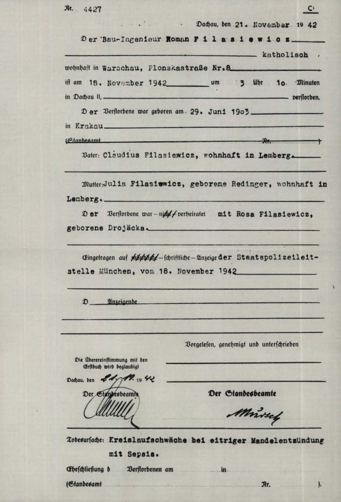 Die Sterbeurkunde von Roman Filasiewicz vom 18. November 1942 indizierte als Todesursache „Kreislaufschwäche bei eitriger Mandelentzündung mit Sepsis“.