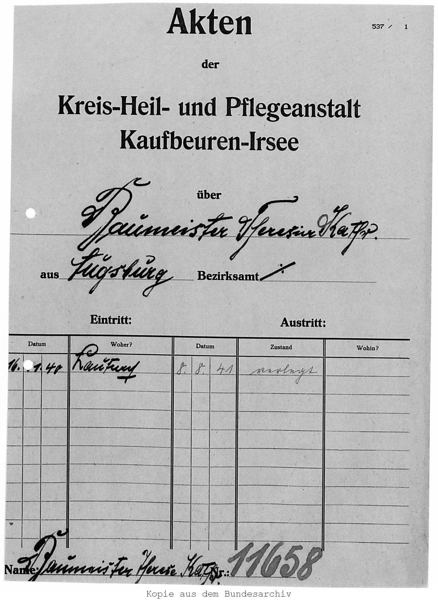 Zu Beginn der „Euthanasie“-Aktion wurden aus ganz Bayern, vor allem aber aus dem Regierungsbezirk Schwaben ab Sommer 1940 Patienten anderer Anstalten nach Kaufbeuren verlegt. So kamen viele Personen aus Ursberg, Holzen, Pfaffenhausen, Glött, Lauingen, Lautrach, Schweinspoint, Günzburg und aus den Kinderheimen Möhren und Stein ins Allgäu, um von dort aus in den Tötungsanstalten Grafeneck und Hartheim ermordet zu werden15 . Ende des Jahres 1939 trafen die Meldebögen des Reichministeriums des Innern (RMdI) in Kaufbeuren ein. Auf diesen Meldebögen musste von einem Arzt vermerkt werden, unter welcher Krankheit der einzelne Patient litt und ob er/sie noch arbeitsfähig sei. Aufgrund dieser Angaben entschieden die ärztlichen Gutachter der Berliner „Euthanasie-Zentrale T4“, ob der Kranke getötet werden müsse oder nicht.