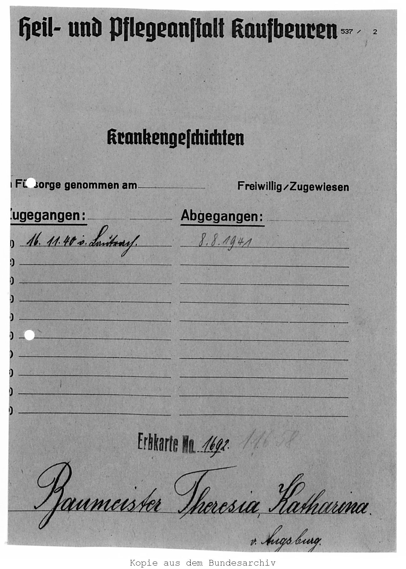 Am Zustand der Patientin ändert sich im Laufe der Jahre wenig. Gemeinsam mit zahlreichen Patientinnen aus Lautrach wird Theresia am 16.11.1940 in die Heil- und Pflegeanstalt Kaufbeuren verbracht. Die Ursache der Verlegung von Lautrach nach Kaufbeuren war einzig und allein die spätere Ermordung der „nicht lebensfähigen“ Patienten in einer Tötungsanstalt.