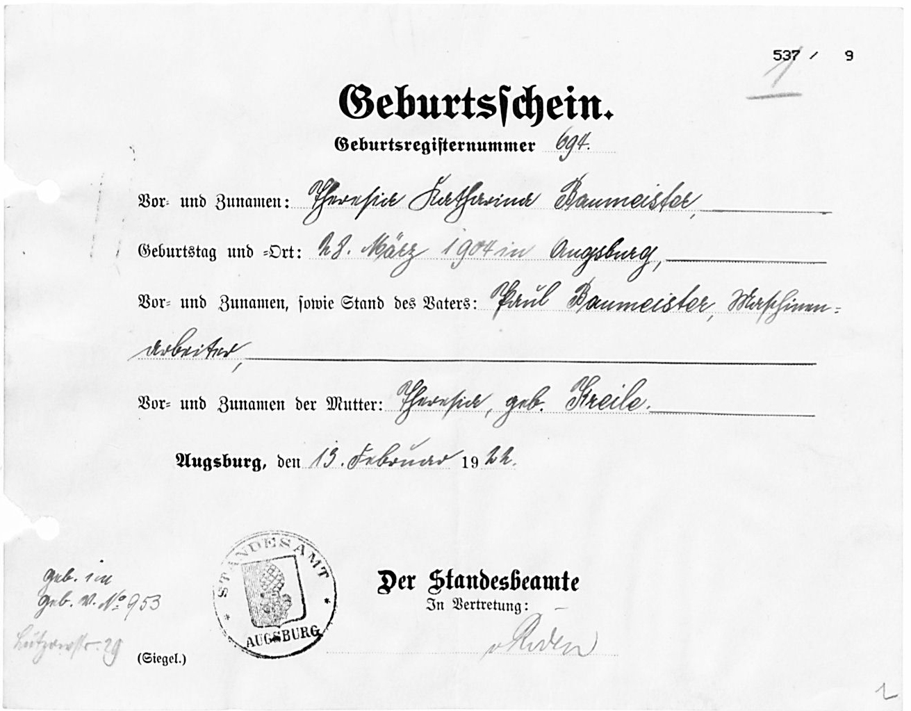 Theresia Katharina ist am 28. März 1904 in Augsburg geboren. Ihre Eltern sind der Maschinenarbeiter Paul und Theresia Baumeister, geb. Kreile1 . Der Vater kommt aus Muttershofen, die Mutter aus Memmenhausen (Kreis Günzburg). Die Familie wohnt in der Äußeren Uferstraße 16. Theresia hat neun Geschwister, vier sind älter als sie: Maria, geb. 1897; Franz Xaver, geb. 1899 (fällt im I. Weltkrieg); Kreszenz, geb. 1900; Bernhard, geb.1901 (verstirbt 1930 in der Heilanstalt Kaufbeuren), Josef, geb. 1905 (hat eine geistige Beeinträchtigung und wird zuhause gepflegt); Paul, geb. 1907 (ist seit 1927 in Hartheim zur Pflege), Johanna, geb. 1911 (verstirbt mit 6 Monaten). 1915 hat die Mutter noch eine Fehlgeburt zu beklagen.