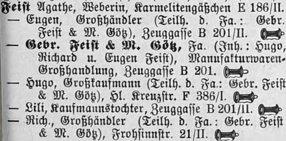 Das Augsburger Stadtarchiv verwahrt den Familienbogen Feist. Demnach sind die Großeltern von Werner David Feist: David Feist Senior (geb. 11.11.1837) und Julia, geb. Gunz (geb. 19.3.1848). Sie heiraten 1868 in Augsburg und bekommen neun Kinder, das zweitälteste ist Hugo (geb. 1871). David Feist Senior verstirbt früh; Hugo Feist und seine Mutter Julia melden im Jahre 1900 gemeinsam mit Hermann Genz unter der Firma „Gebrüder Feist und M. Götz“ einen „Manufakturwarenhandel en gros“ in der Zeuggasse 9 an.